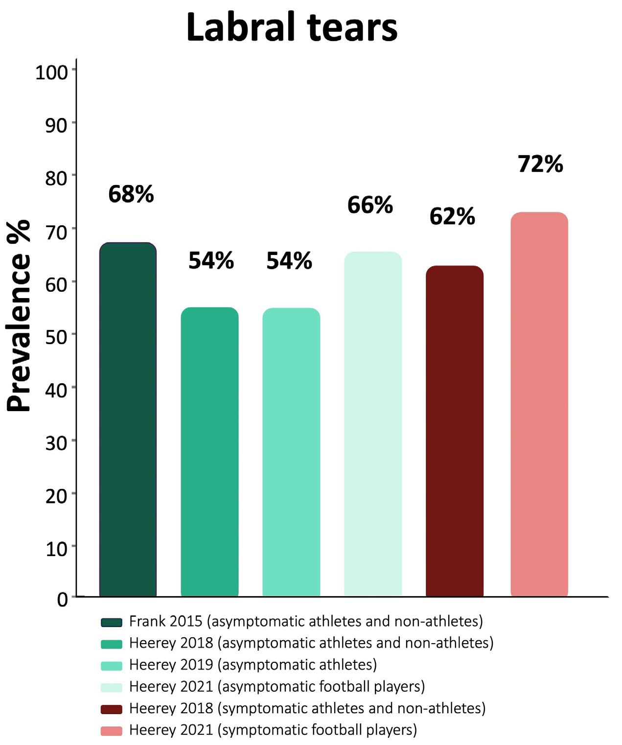 Recent evidence suggests that a high and similar prevalence of labral tears are seen in people with (62%) and without pain (54%).