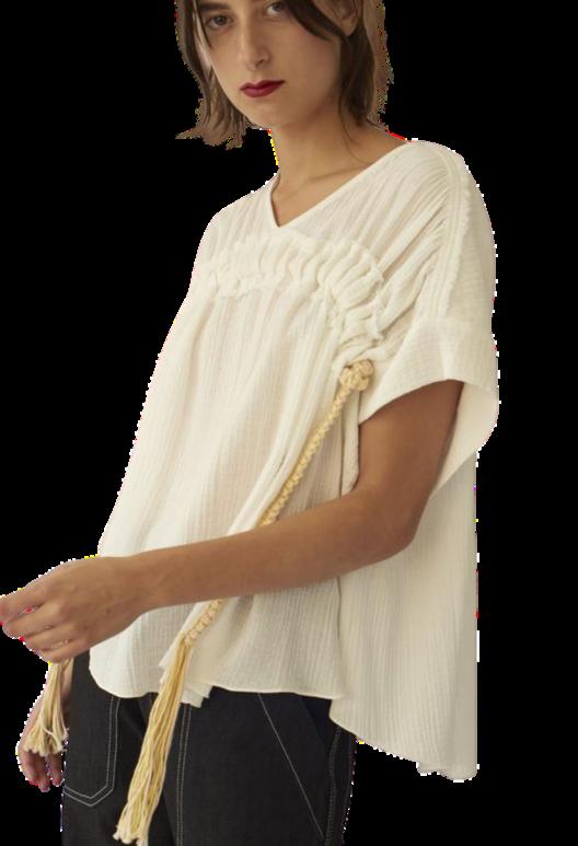 Podemos observar um dos principais it Fashion P/V 2023, são as blusas de te fluidos e volumosos com modelos mar como também a blusa com os ombros valorizar o colo, revelando pontos estr de pele, sendo uma grande tendência #modernoccasionee e #Ruching como WGSN.