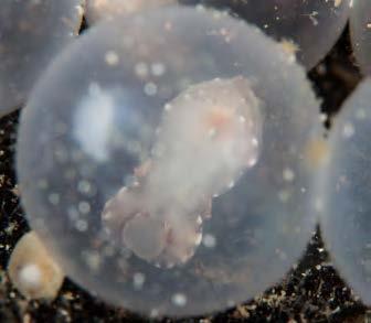 漸變成半透明狀,從卵殼 外就能看得到裡面的烏賊 寶寶。卵的孵化期約6~ 8週,小烏賊孵化出來後, 就已擁有變色偽裝的能 力,能夠獨自在海底世界 展開新的旅程。