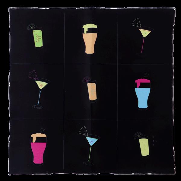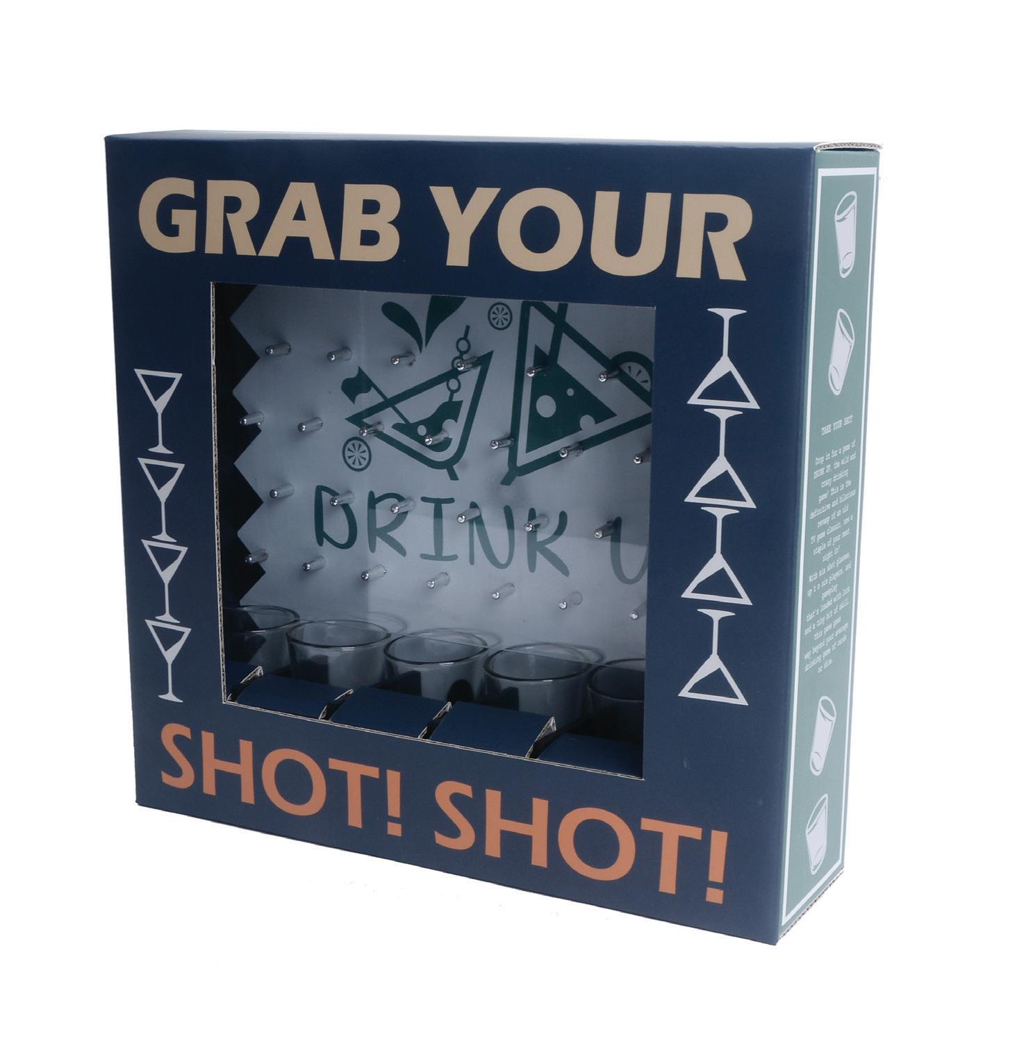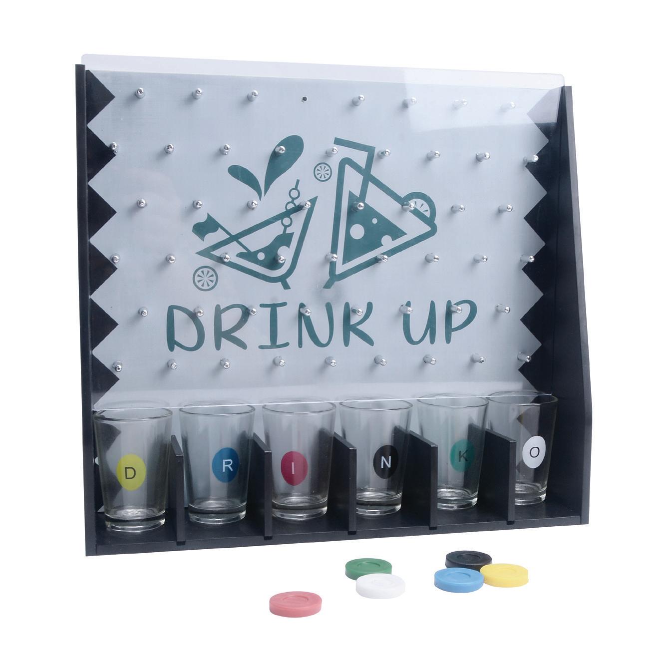 Set includes six shot glasses and six colored chips. Each chip color matches the color printed on a glass. Place your colored shot glass at the bottom of the board, and grab your token. Then, take turns dropping your tokens through the Drink Up board, and whoever’s lettered spot they land on is the drinker!