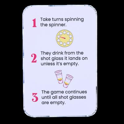 Getreadyforathrillinggameofchanceandanightof fun! Take turns spinning the spinner and downing the shot glass it lands on, unless it's empty Keep the fun goinguntilallshotglassesareempty!