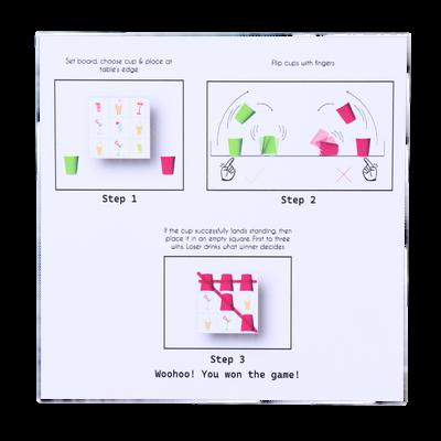 Divide players into teams. Place cups on the table's edge. Take turns flicking cups If a cup lands standing, place it in an empty square.Thefirstteamtogetthreeinarowwins.