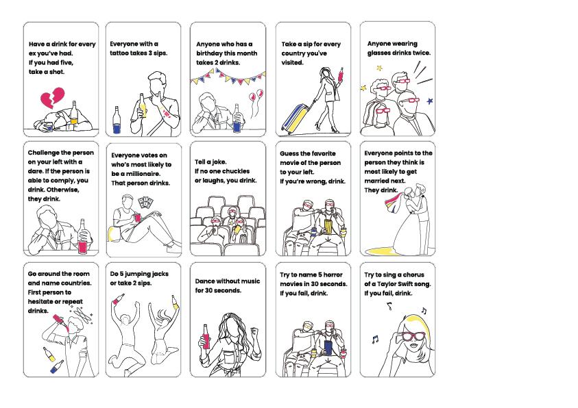 • Get 1 card then read the description aloud. Whoever is described by the card should take a sip. The number of sips that needs to be taken depends on the color of the card. Start drinking then go to the next round.