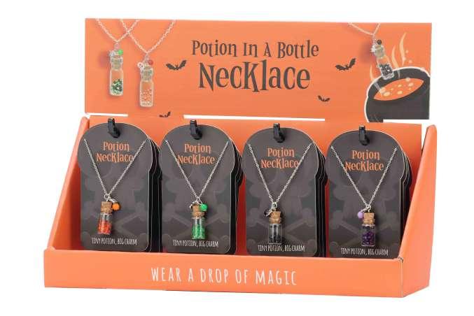 This spooky potion-in-a-bottle necklace adds a magical touch, perfect for enhancing the Halloween style