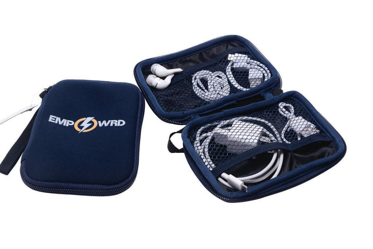 An organizer pouch with compar tments for chargers, earphones, and other accessories