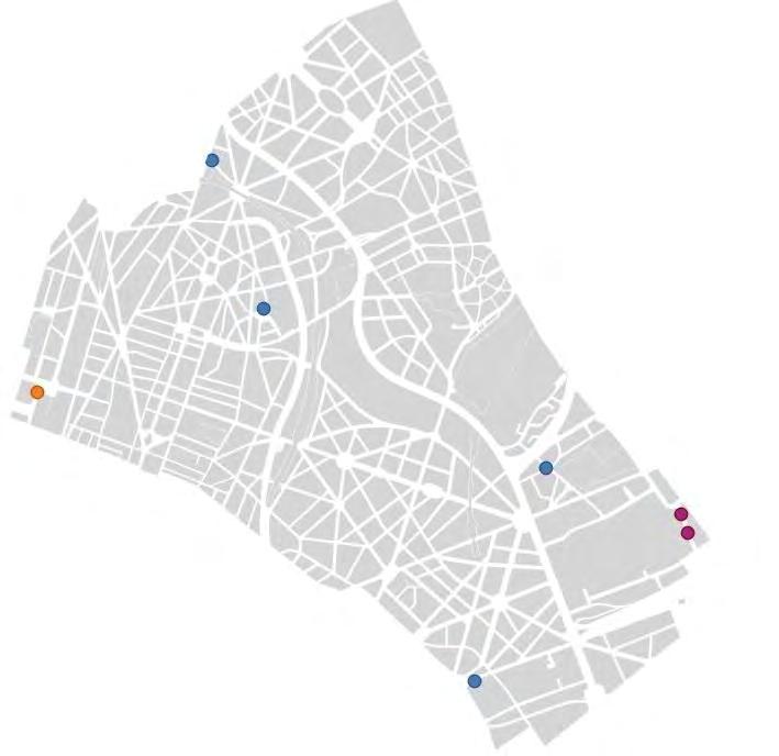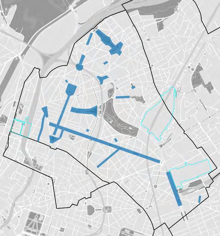 Figuur 93: Locatie van toekomstige heraanlegprojecten van de openbare weg met impact op het aantal parkeerplaatsen (Bron: Gemeente Schaarbeek, 2021) en van plannen en programma's (Bron: Brugis, Perspective)