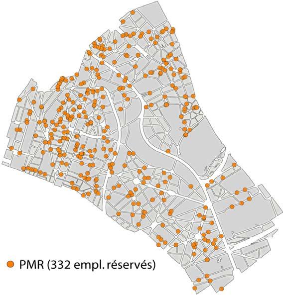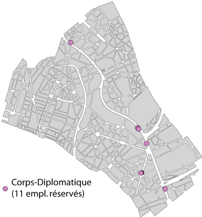 • Gereserveerde parkeerplaatsen (PBM, leveringen, bussen, Corps Diplomatique) : Het parkeeraanbod op de openbare weg omvat 968 gereserveerde parkeerplaatsen1, wat 4% van het totale aantal parkeerplaatsen uitmaakt. Deze parkeerplaatsen zijn relatief goed verspreid over het volledige grondgebied van de gemeente.