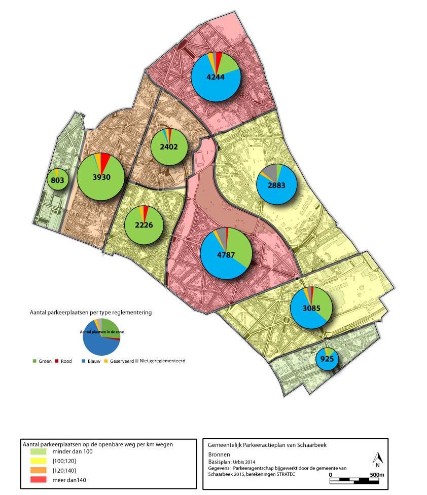Figuur 3: Aantal parkeerplaatsen op de openbare weg en spreiding ervan binnen het Schaarbeekse grondgebied