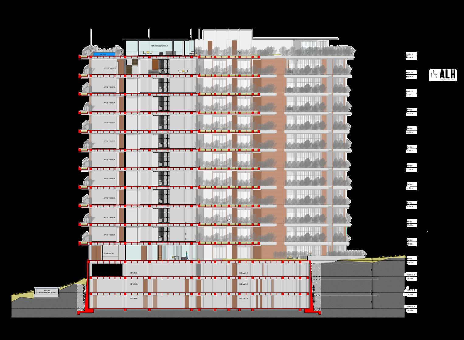 La parte del primer nivel se amplia con el fin de dar más espacio para los sótanos y logrando unas terrazas habitables las cuales se convierten en zonas de integración para los habitates