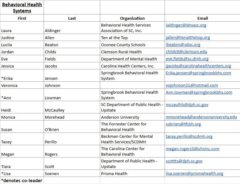 The Resilient Upstate Behavioral Health Collaborative is an effort to leverage the individual and collective expertise, experience, opportunities, and challenges of all entities engaged in supporting behavioral health in the Upstate SC region. The three lead partners for the effort are the South Carolina Office of Rural Health (SC ORH), the South Carolina Department of Public Health (SC DPH), and Ten at the Top (TATT). In 2024, the collaborative developed working groups around four primary areas of focus. Each workgroup met separately to address barriers and resources for behavioral health subtopics identified within each group. They also developed goals and outcomes that will effectively impact the individual and collective capacity of the region around those subtopics.