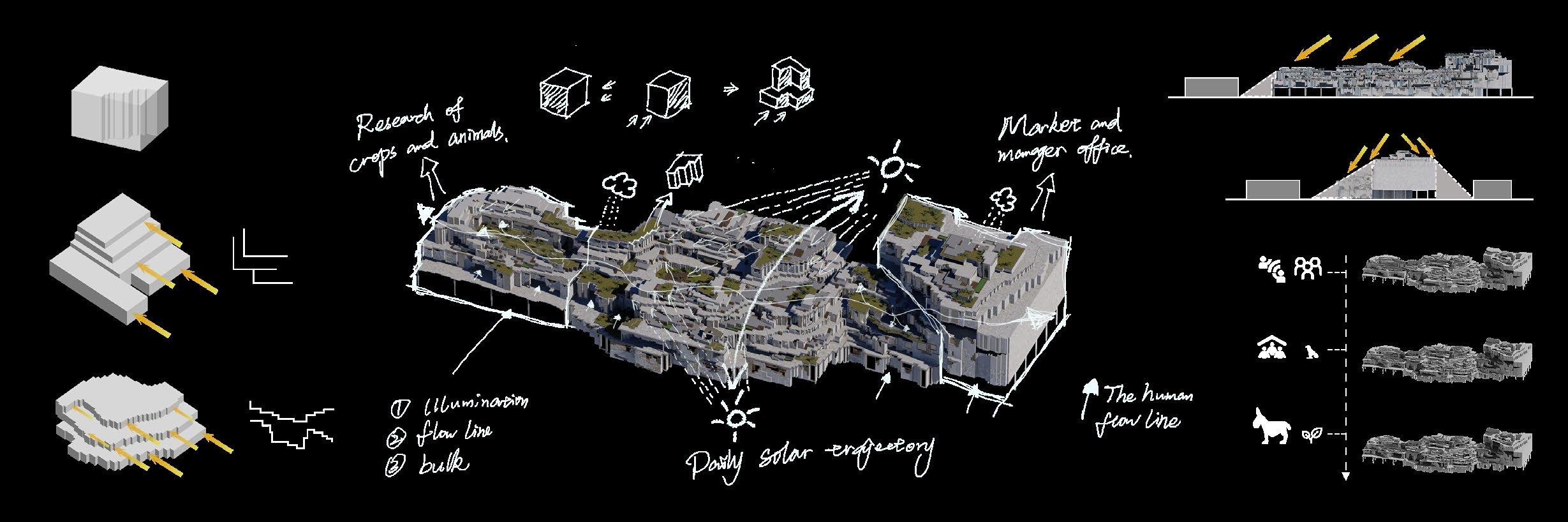 The various components of the building and the process of transforming the volumes of these parts are introduced. The facilities and transportation around the building are introduced. Some renderings of the perspective of people and airships are shown.