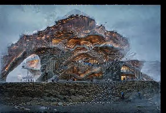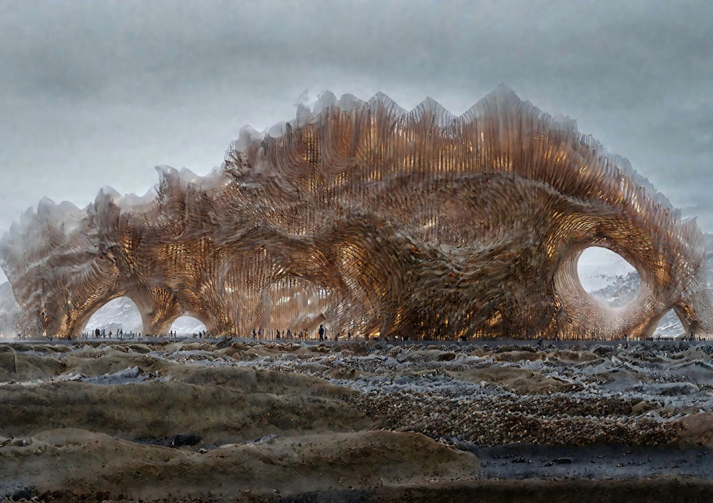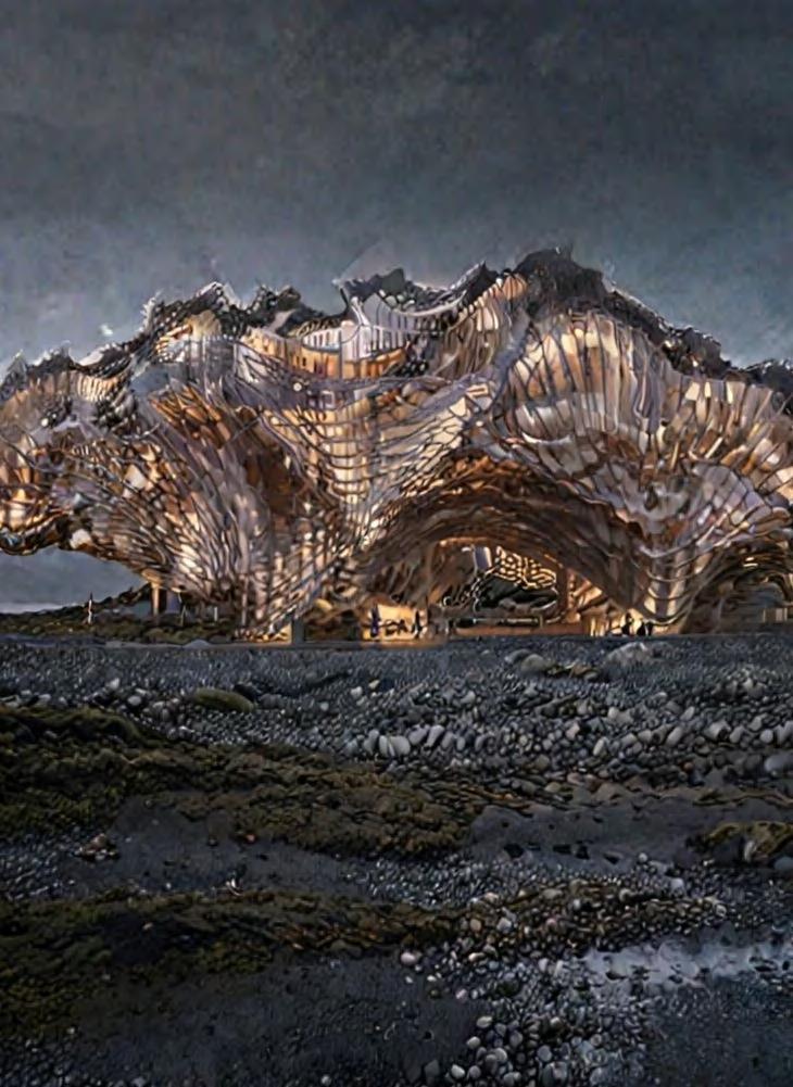 Zaha style, futuristic, a huge organic structure in the reef seaside that resembles intertwined shell rocks and has a porous texture, Rocky shoreline, Iceland, seaside, black sand beach, rocks and shells