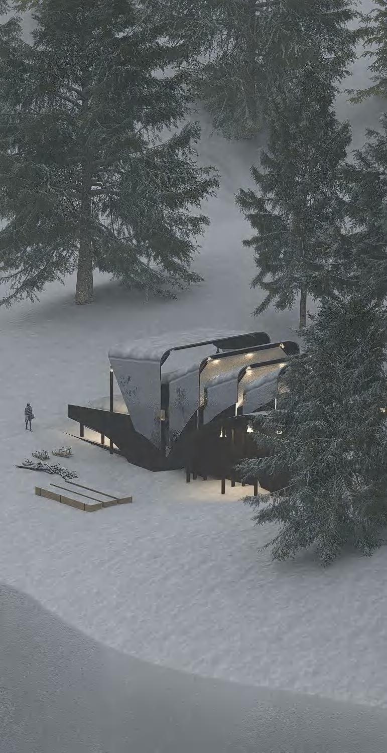 This cottage designed for the Inuit is like a bright pearl in the snow. It cleverly combines traditional and modern design concepts. The main structure is built of sturdy wood, locally sourced materials, and adopts mortise and tenon construction, which not only resists polar winds, but also demonstrates the harmonious beauty of nature and humanity. The exterior design of the chalet borrows from the Inuit whale totem, and the streamlined design complements the surrounding snow-covered environment.