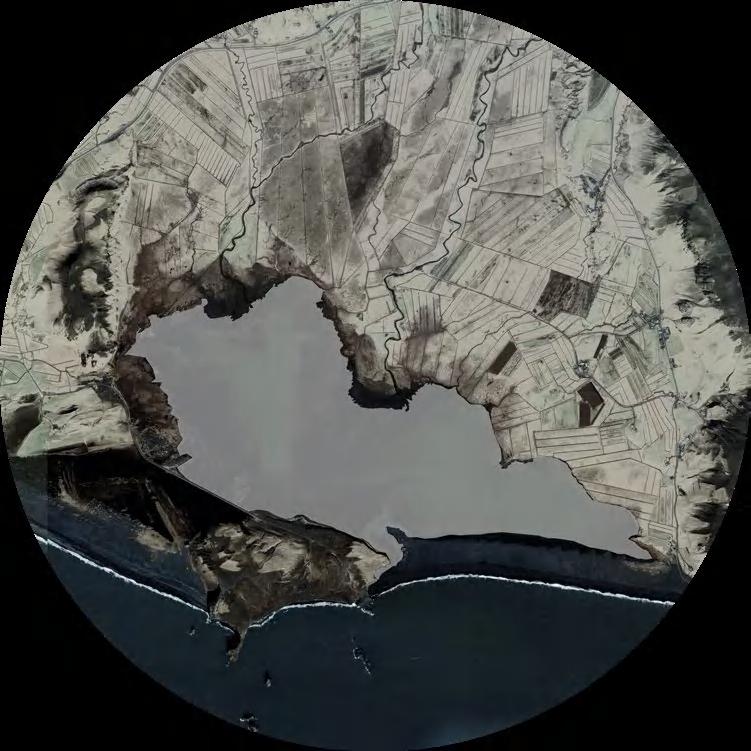 A huge organic structure in the reef seaside that resembles intertwined shell rocks and has a porous texture, with Multiple openings, with elegant, desaturated colors, emphasize the unique and artistic design of the structure.