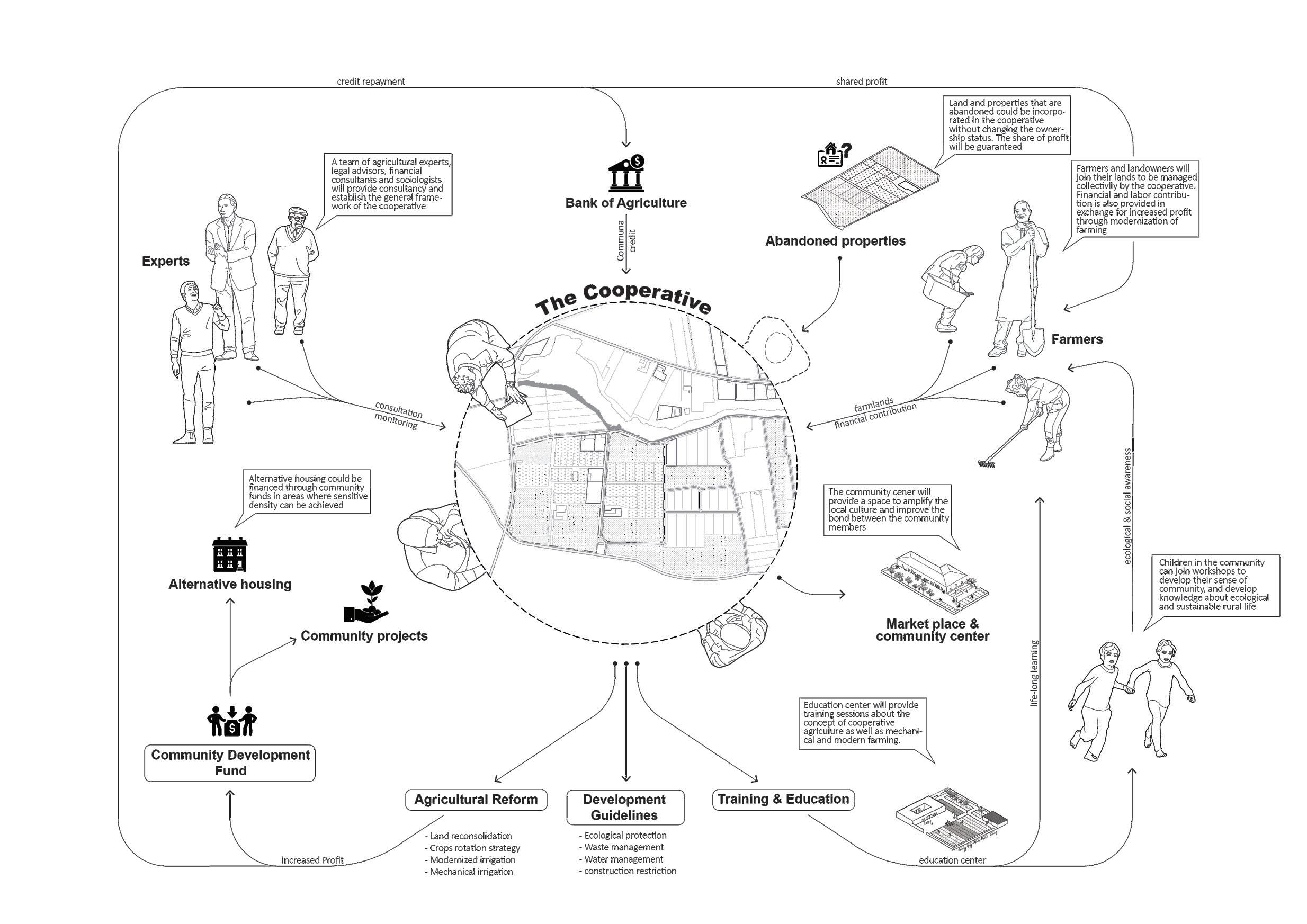 SMALL COMMUNITY SCHOOL TO ENSURE THE PARTICIPATION OF SCHOOL TEACHERS AND STUDENTS IN THE PILOT PROJECT TO EDUCATE THE SUSTAI ABLE WAYS OF AGRICULTURE AND COMMUNITY BUILDING. COMMUNITY SPACE FOR THE WORKSHOP, MEETING PLACE FOR COOPERATIVE, MONTHLY HEALTH CARE CONSULTANCY. SMALL WEEKEND TEMPORARY OUTLET FOR THE CROP PRODUCED IN THE COOPERATIVE LANDS 26 2 2 3 3 4 4 PHASE_4 INTERVENTION POINTS FOR PILOT PROJECT 1