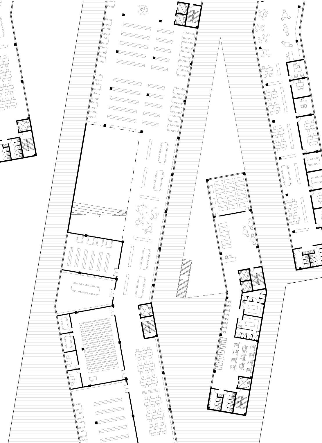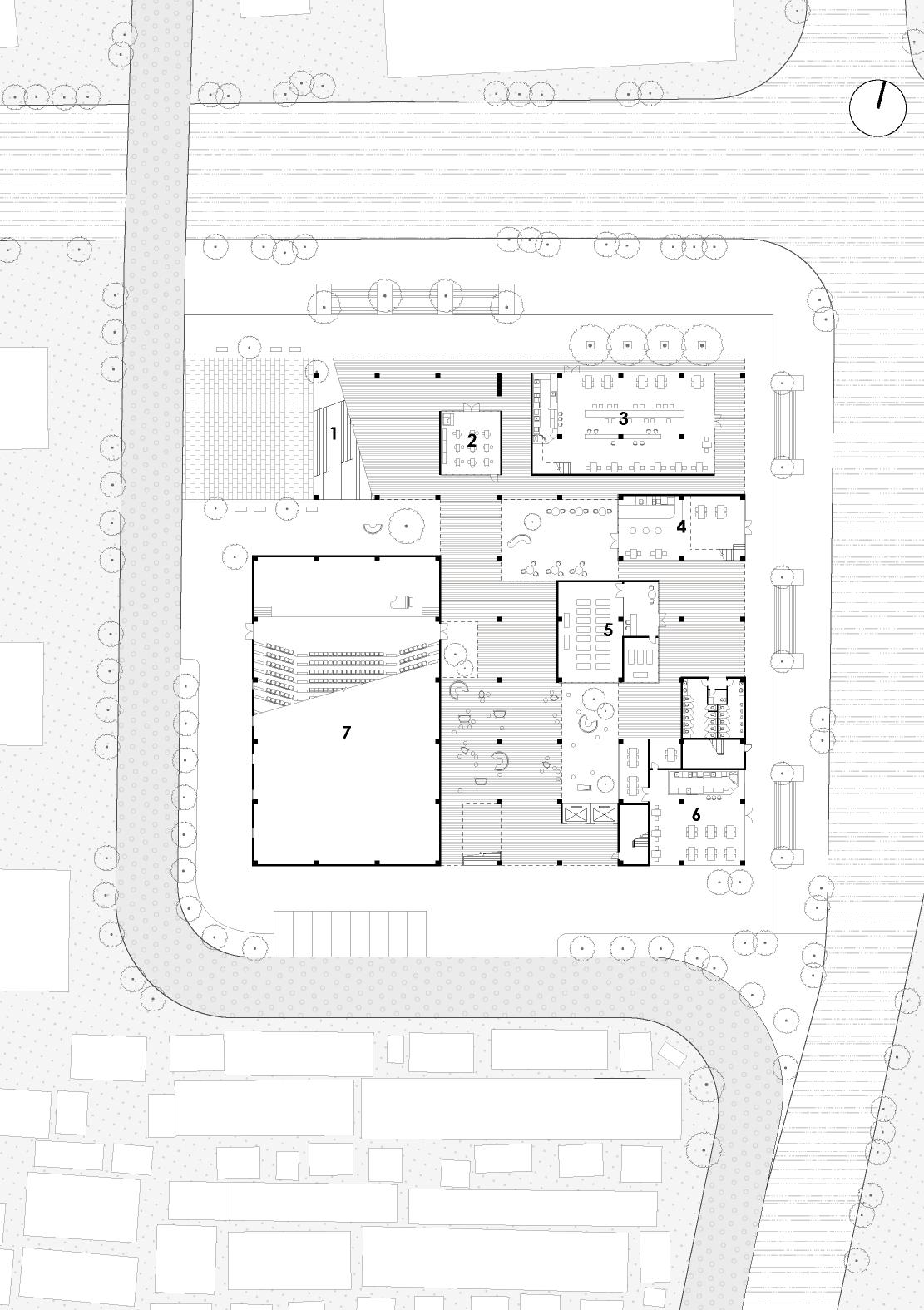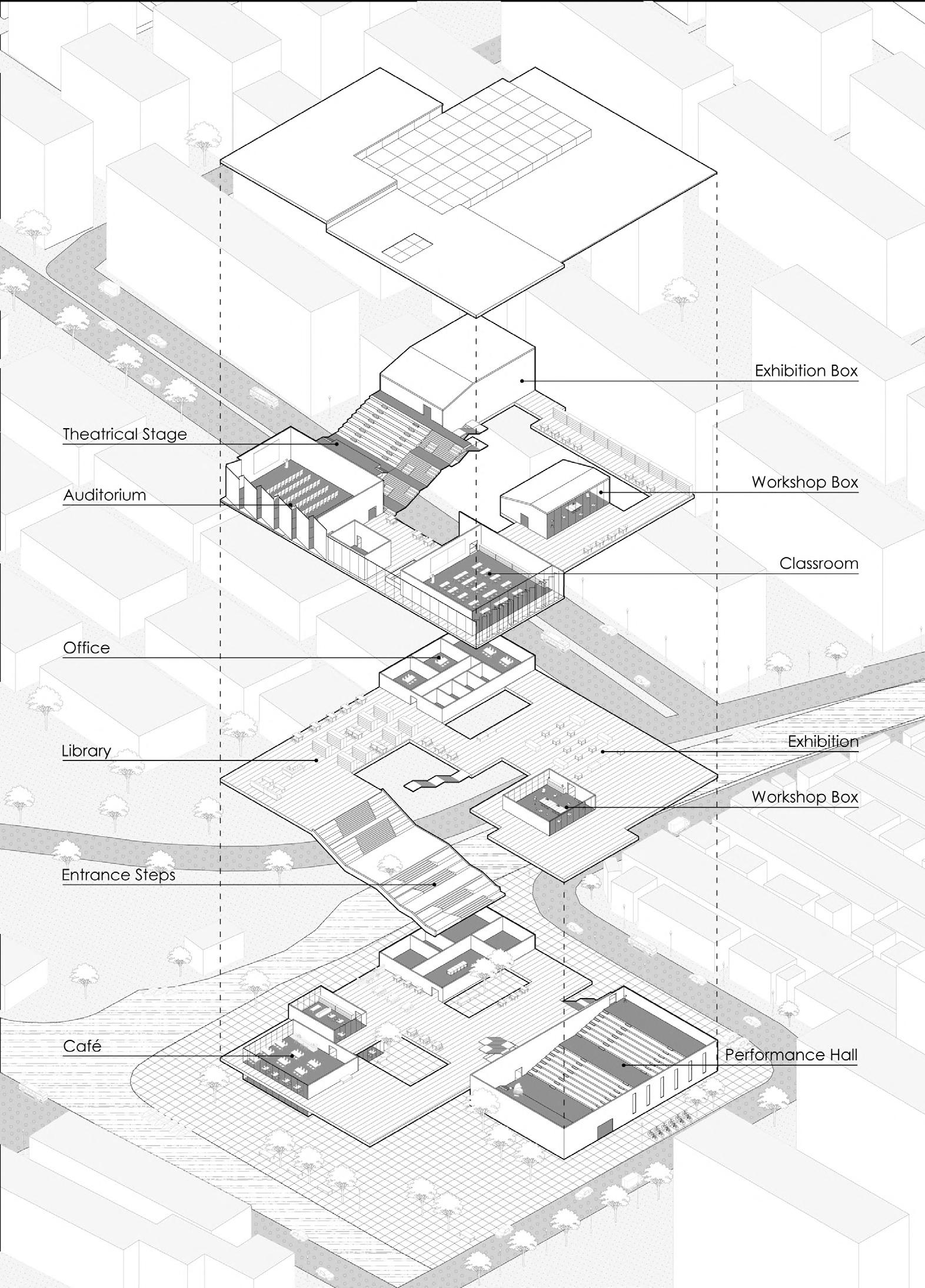 This community center project is located at the Tianzhizhuang District of Suzhou, China. According to the field analysis, I found that there is a mixed flow of people around the site. Students have a need for extracurricular activities, while local residents and visitors need a place that offers leisure activities. Therefore, my idea is not only to fulfil the functionality of a community center, but also to make the building accessible to the surrounding residents, students and visitors for daily using. The project contains 5 floors, and major program elements include: Theater, Bookstore, Library, Restaurant and Café.