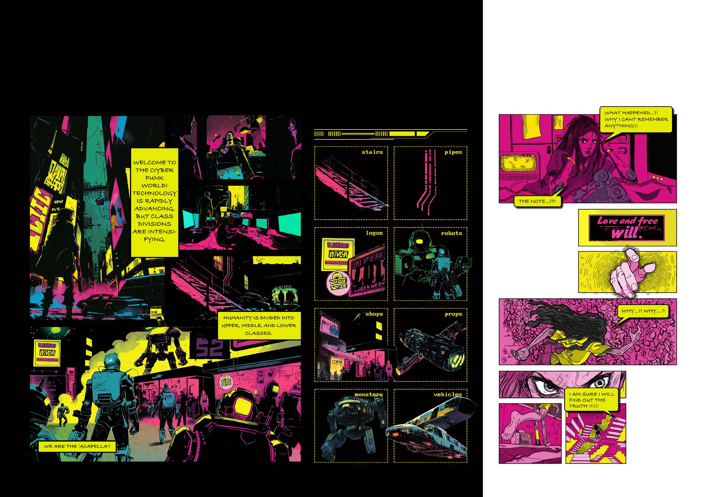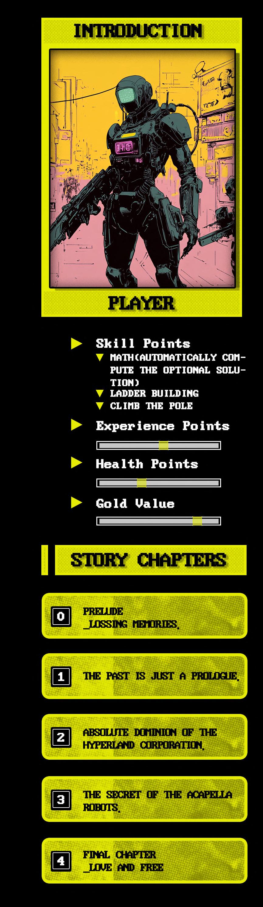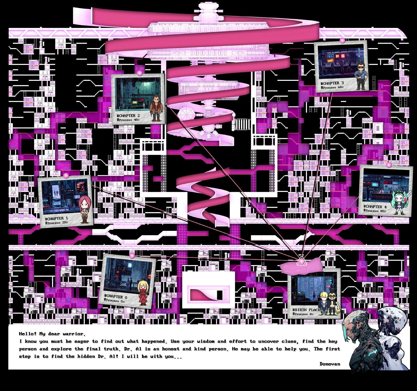 This is a cyberpunk-style platform game where each chapter's reward is a piece of the protagonist's memory puzzle. As the levels are completed, the truth behind the protagonist's amnesia gradually emerges. It's a story about friendship, courage, conspiracy, capitalism, and, most importantly, love and free will. Each chapter corresponds to a key character. By continuously climbing and searching for relevant items and clues, you'll have the opportunity to engage in in-depth conversations with the key characters.