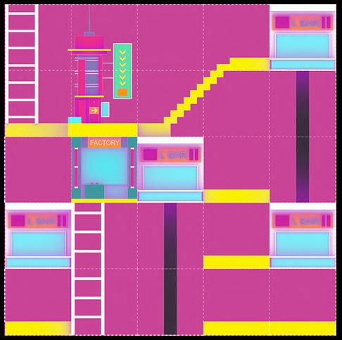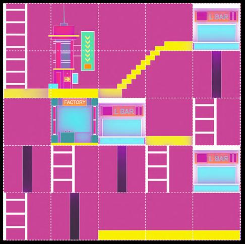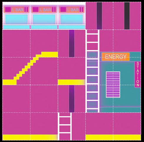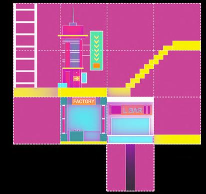 The space is automatically filled with a digitally developed wavefunction collapse algorithm and labelled ‘+’ or ‘-’ (one side of a voxel with a ‘+’ sign can be connected to another voxel on the same axis with a ‘+’ sign). 11 units of the main functional categories have been set up, some of which have modular variations in size (basic module: 1x1x1 metre). These units are evenly distributed in the set space and are connected to a number of paths and platforms.