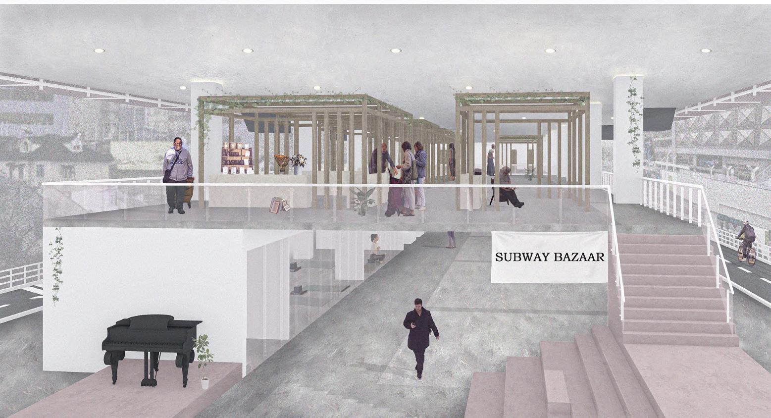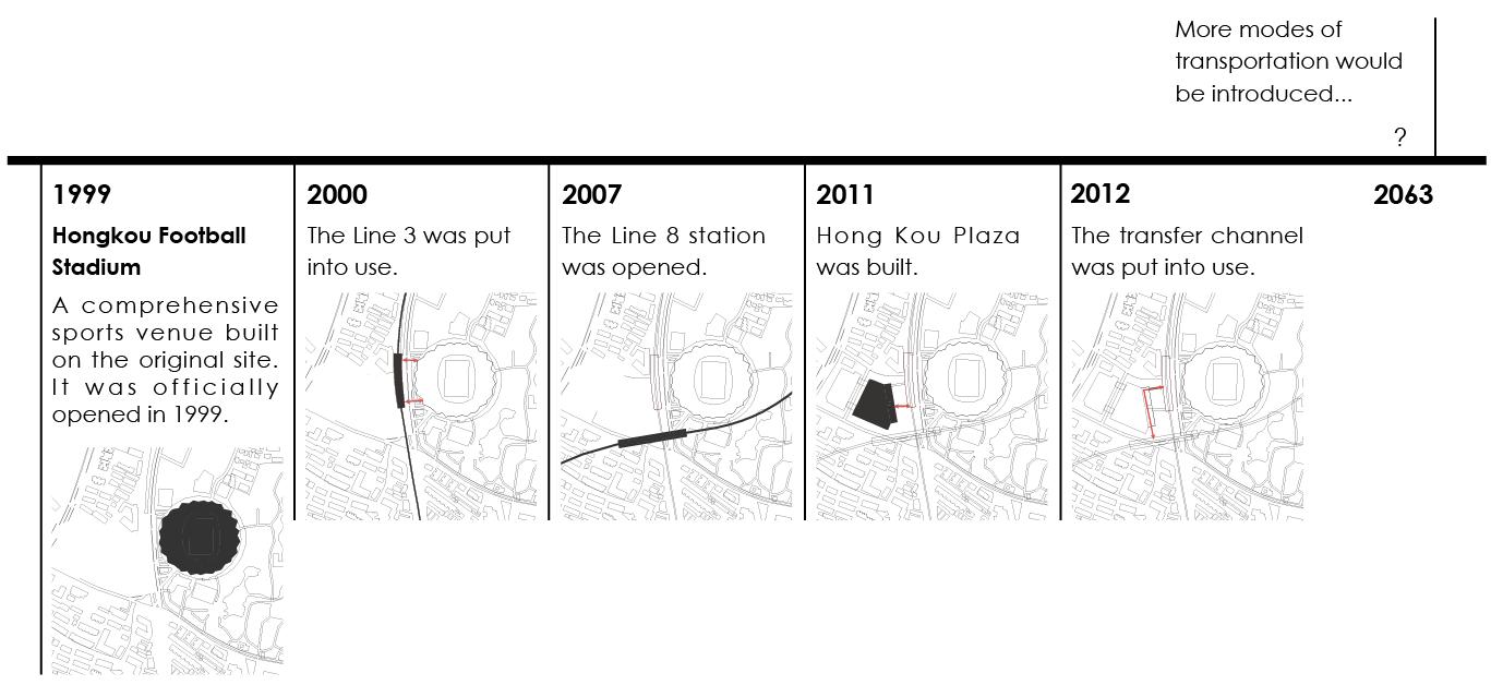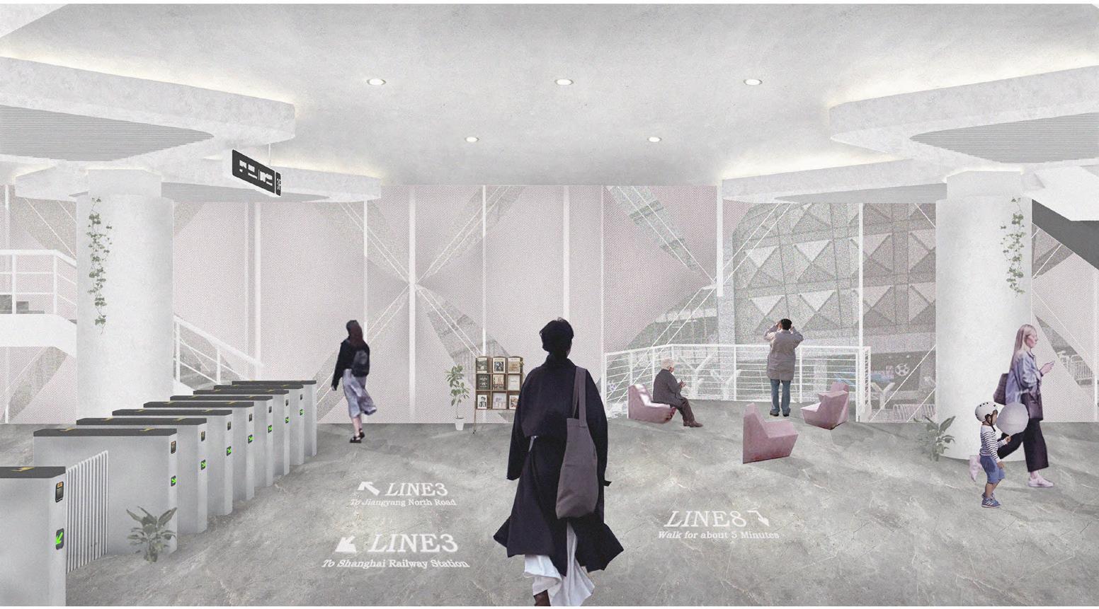 When the time fast-forward to 2063, the site problem of Hongkou Football Stadium Metro Station would be solved. The originally closed space is opened, and different functional spaces would be placed in it. The traffic efficiency would be improved, and it would become an energetic space providing resting places for the citizens and tourists, giving people a sense of relaxation and freedom.