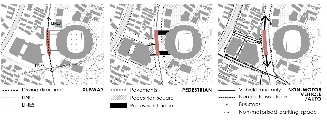 It is found that the current station only serves as a single transport function, the public space inside the station is closed and lacks interest, while the parallelism between motorised vehicles and non-motorised vehicles outside the station is prone to cause traffic congestion and chaos. With the passage of time, these conflicts will continue to intensify.
