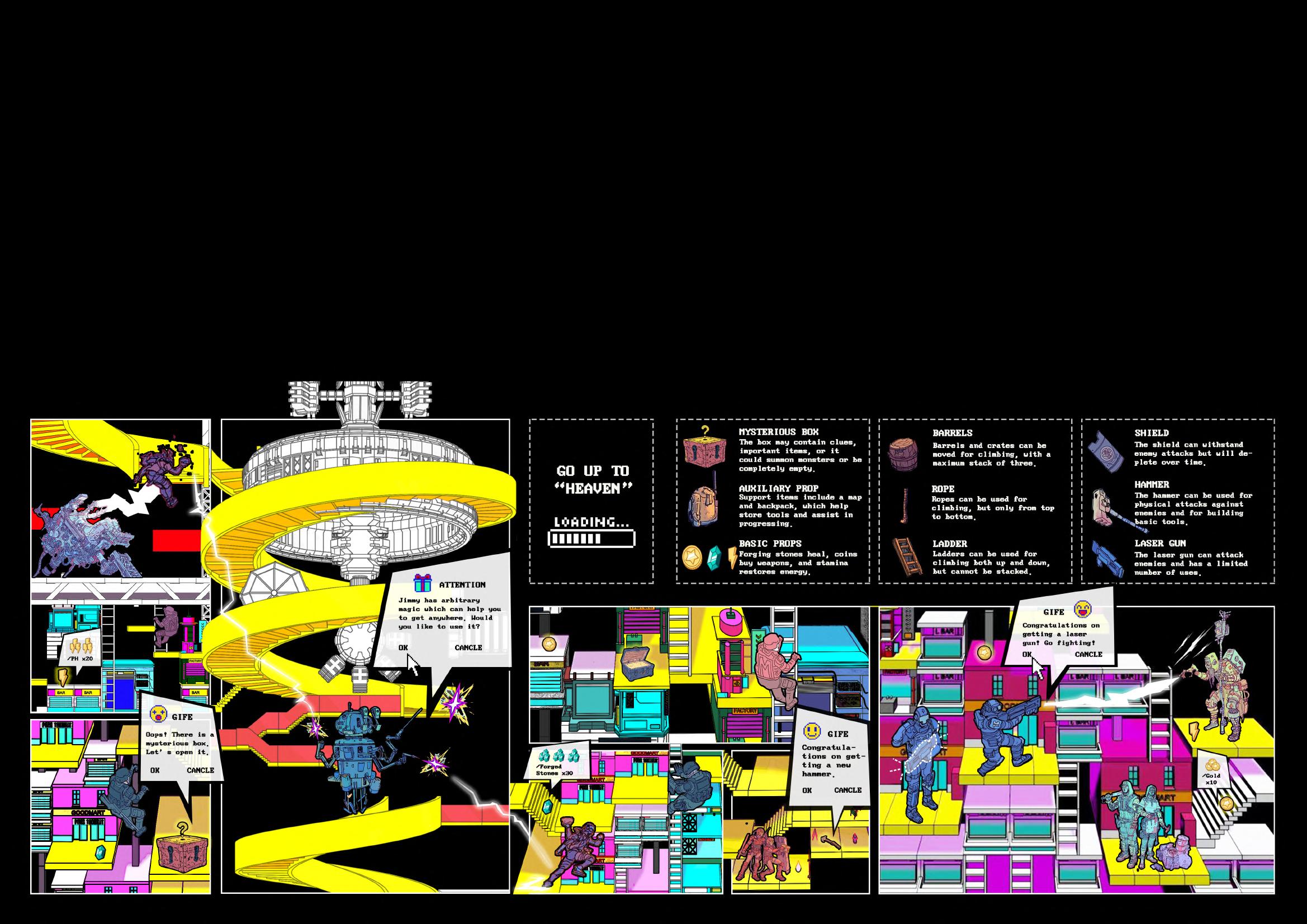 The game is a vertically oriented climbing game with a cyberpunk background, in which climbing gears are exchanged by collecting gold props and interspersed with clue collection and character dialogues to complete the process from the beginning of amnesia to the final decryption.