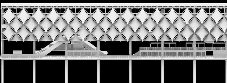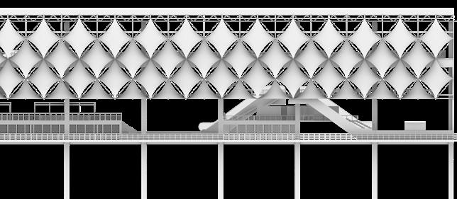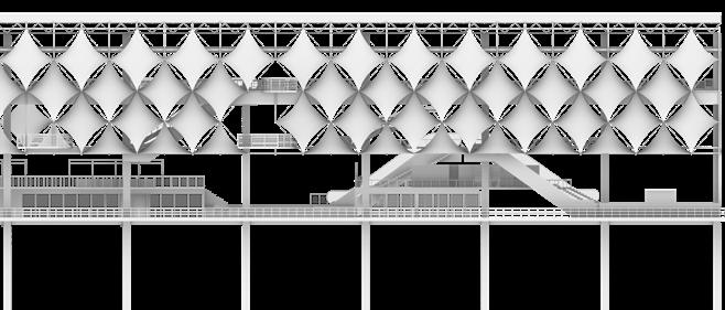 Facade Transformation: Part of the tensile membrane is opened and the platform extends from the opened part, enriching the facade.