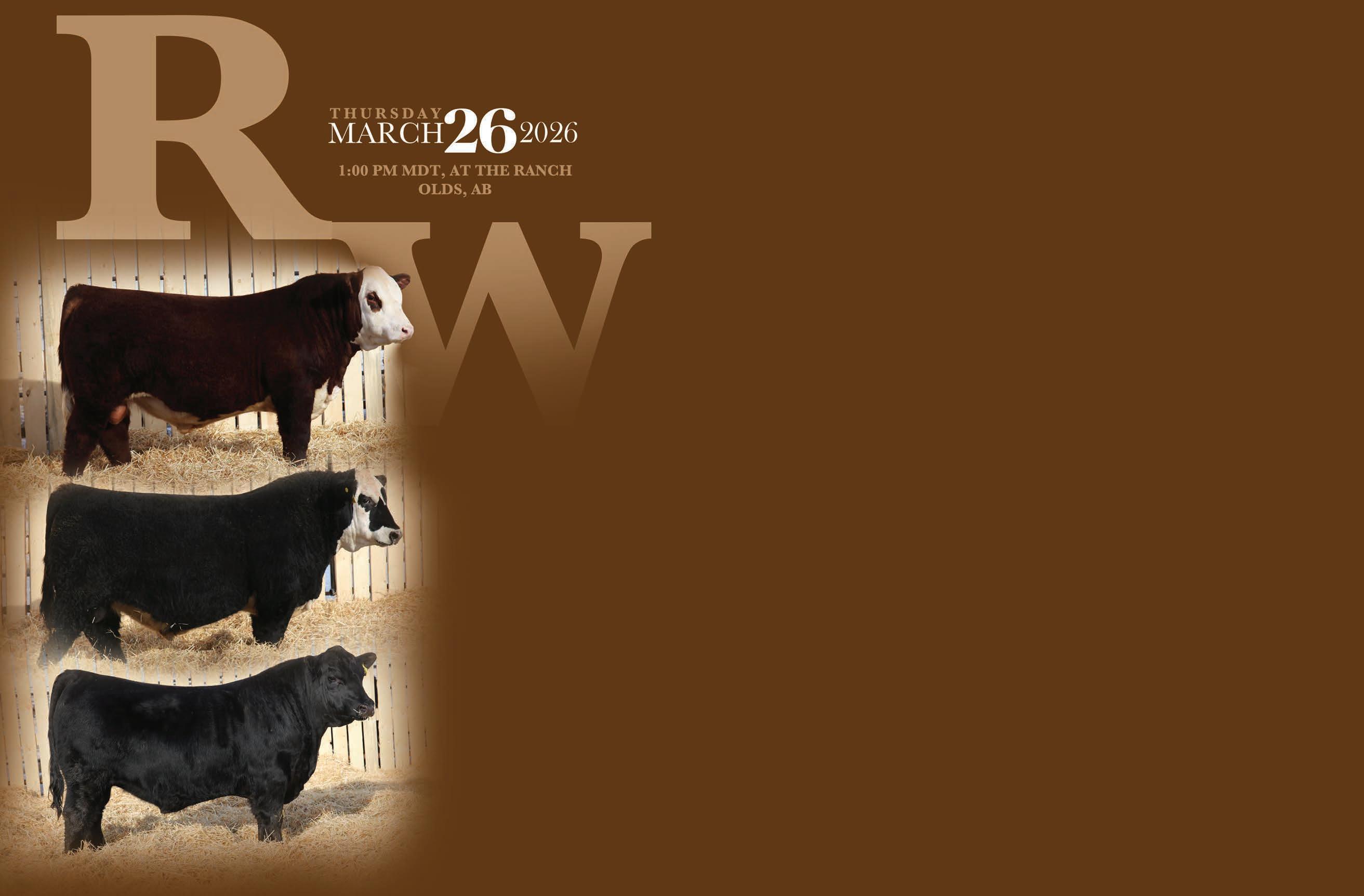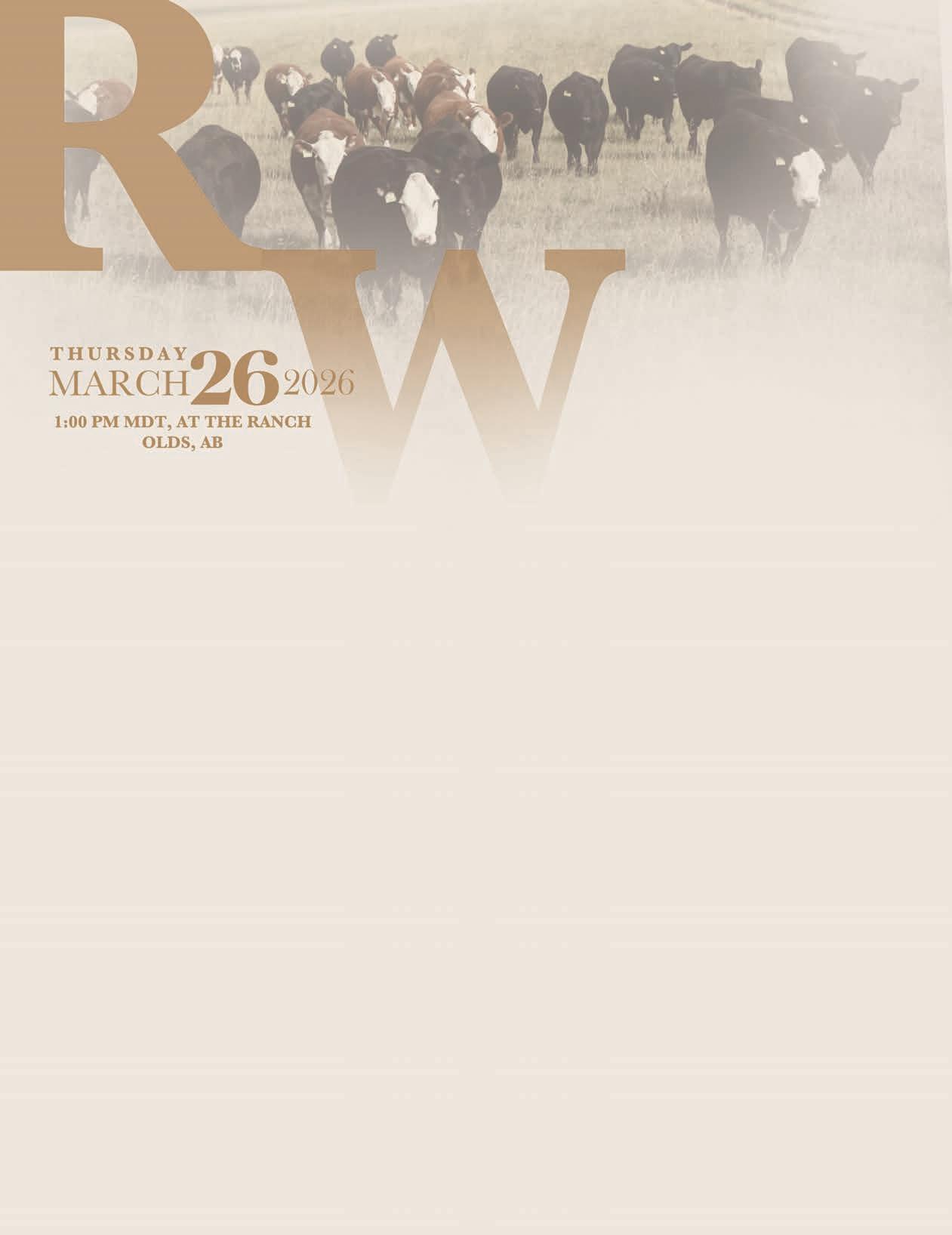 TIME & PLACE 1:00 p.m MDT, Thursday March 26th 2026 - Remitall West Sale Barn, heated facility with indoor washrooms. (location: 32275 Range Rd 20, Didsbury, AB). The Remitall West Ranch is located from the west edge of Olds on HWY 27, go 3 miles south on Range Road 20. Please join us for complimentary lunch and refreshments sale day.
