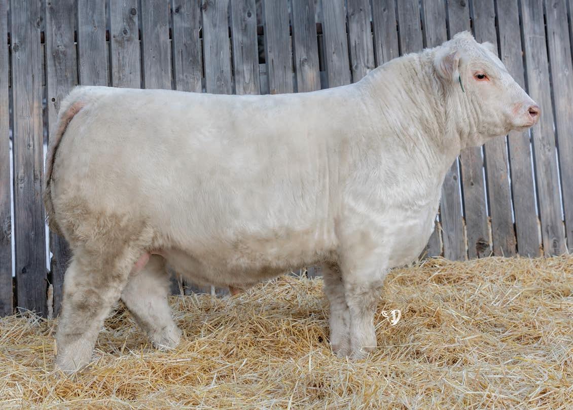 “ALL MEAT AND POTATOES...” were the words judge Jill Mader used to describe this bull calf in Edmonton. He has that unmistakable swagger that stops you in your tracks. Sired by the increasingly popular Keystone bull and out of a matriarch in our embryo program, Miss Prairie Cove 748E, this isn’t the first time she has produced the Lot 1 sale bull. Last year, his maternal brother, Matrix, was the high seller to Landaker Charolais. Four years ago, another maternal brother, SOS Kickstart 825K was the lead-off bull and high seller to Steppler Farms and went on to become Agribition Grand Champion Bull and BOSS Show Bull of the Year.