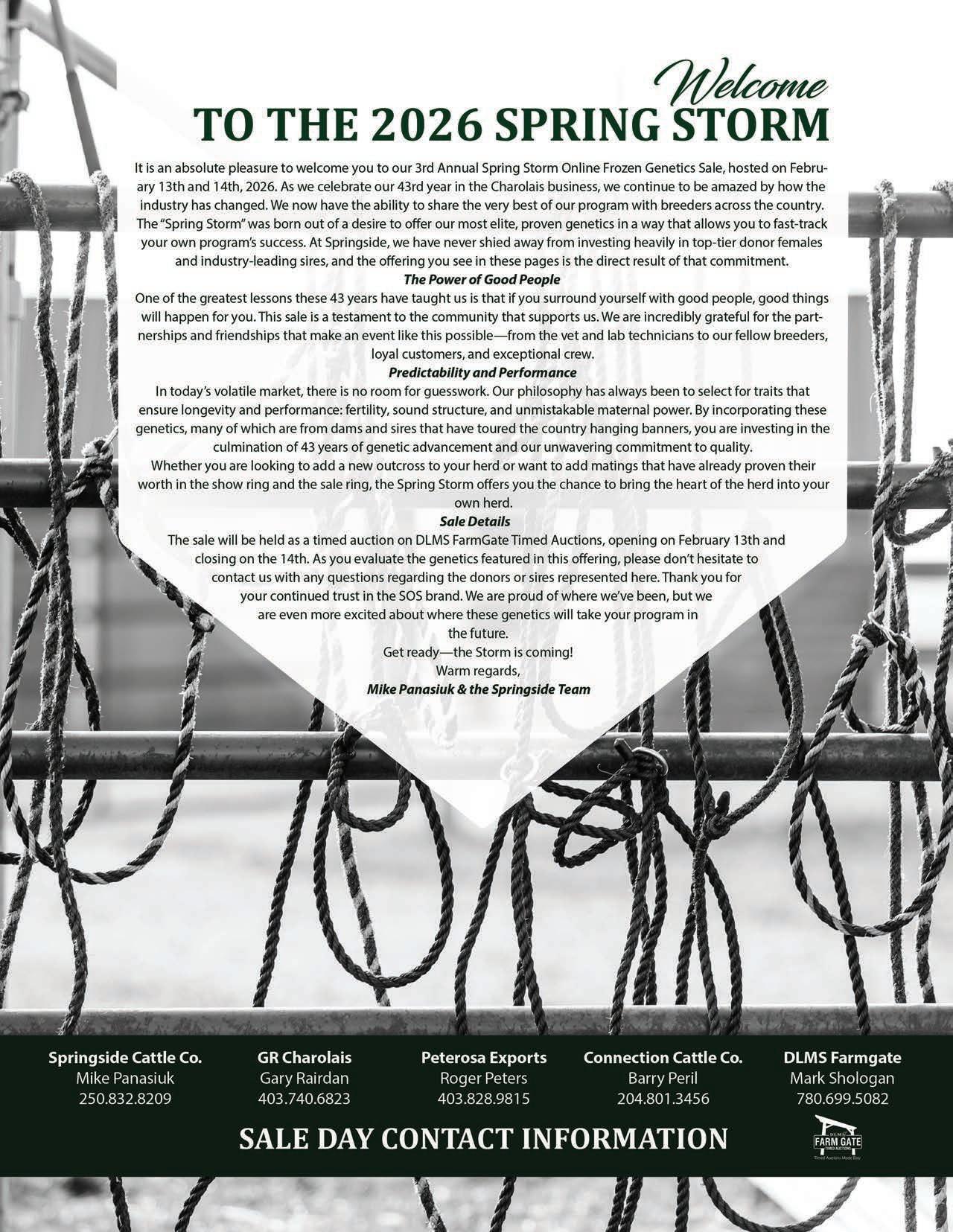 YOUR SUCCESS IS OUR SUCCESSWe are incredibly proud to see Springside genetics thriving in your programs. Thank you to the breeders who have invested in our ET program.KG/SOS KEYSTONE ICE 148N KEYSTONE X SOS PRINCESS KATE 33Y sells as Lot 44 - listed on page 30W2 MISS PRINCESS KATE 579N GLOBAL X SOS PRINCESS KATE 33Y W2 FarmsC2 MISS EMPRESS 402M MAYFIELD X SOS EMBRESS 129H C-2 CharolaisC2 MISS KENZIE 448M DUTY FREE X C2 KENZIE 13B C-2 CharolaisC2 KENZIE 4134M RUGER X C2 KENZIE 13B C-2 Charolais