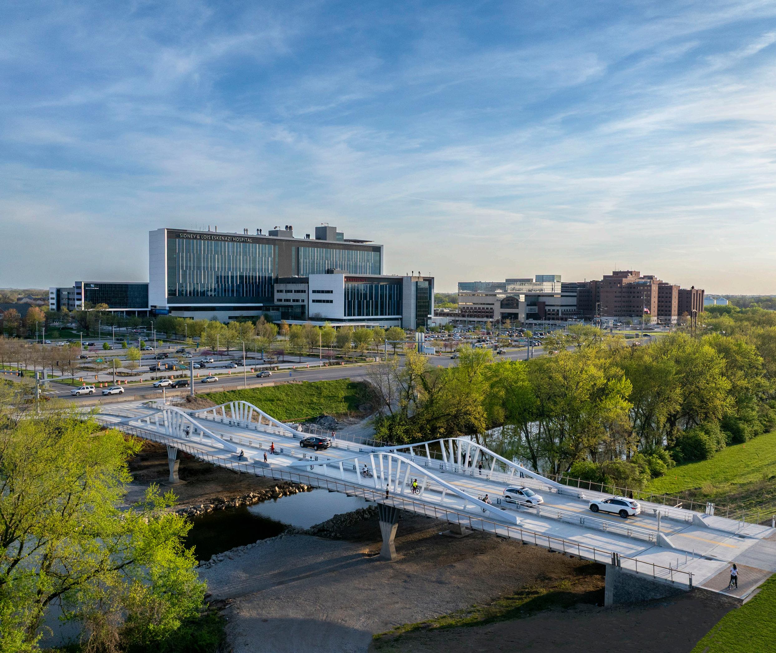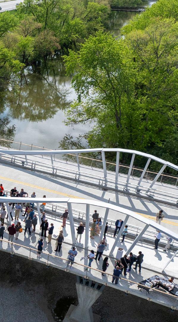 Opened 2025, the multimodal bridge offers connection for pedestrians, cyclists and drivers, strengthening access to 16 Tech and the regional trail network.
