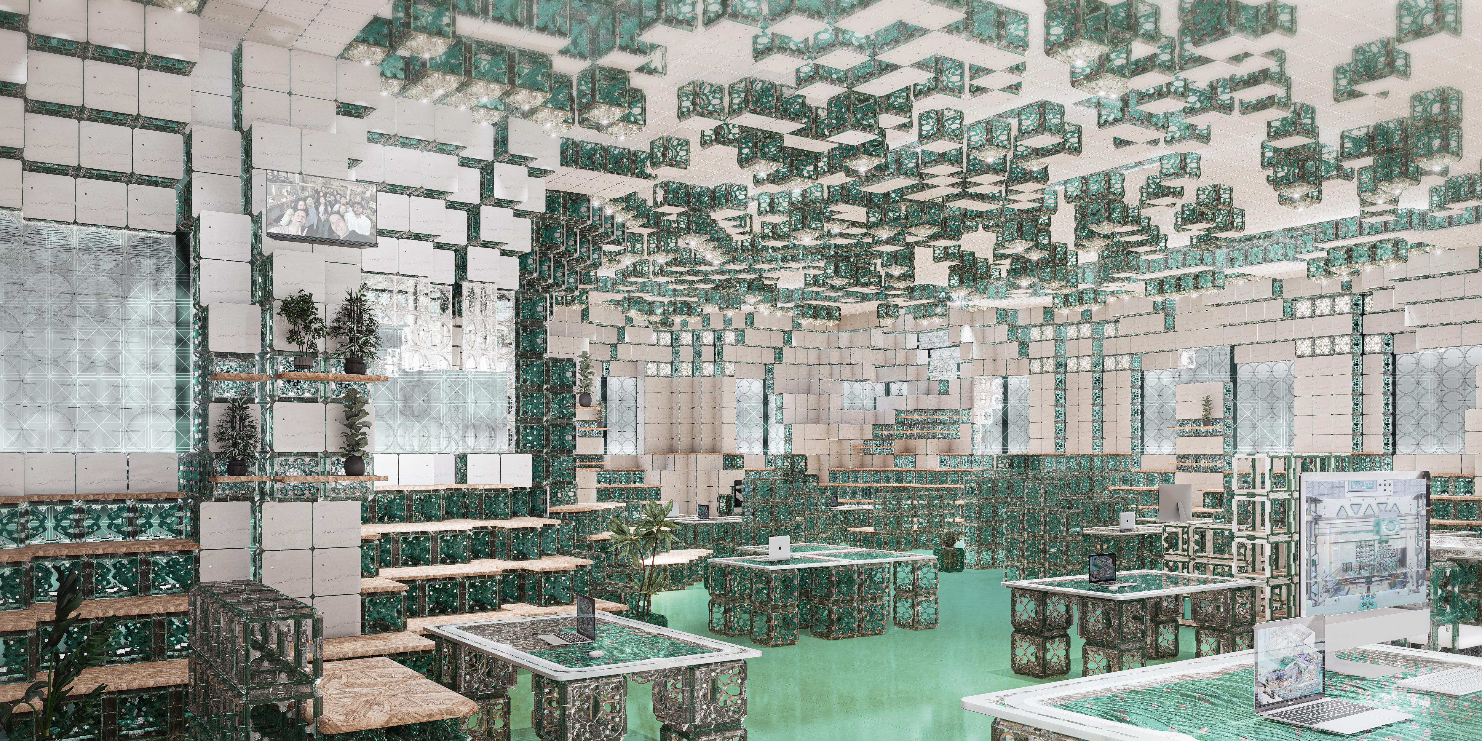 The spatial system is composed of modular units whose geometry defines the assembly logic, spatial rhythm, and environmental performance.