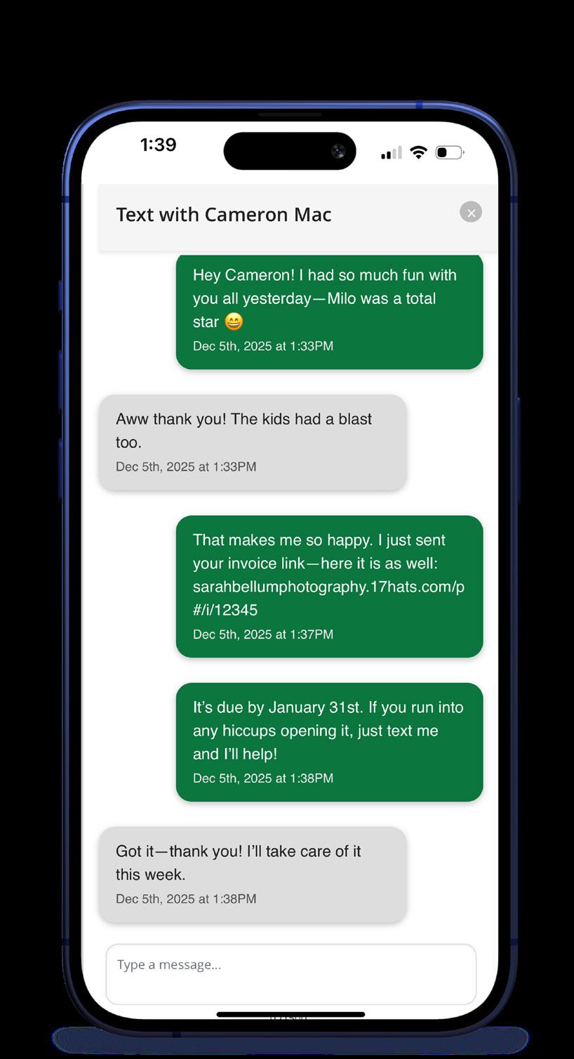 Reach out to a business friend with a quick text or DM: “Hey! If you’re still juggling client stuff manually, you should check out 17hats. Here’s my referral link for 50% savings — it’s a no brainer!”