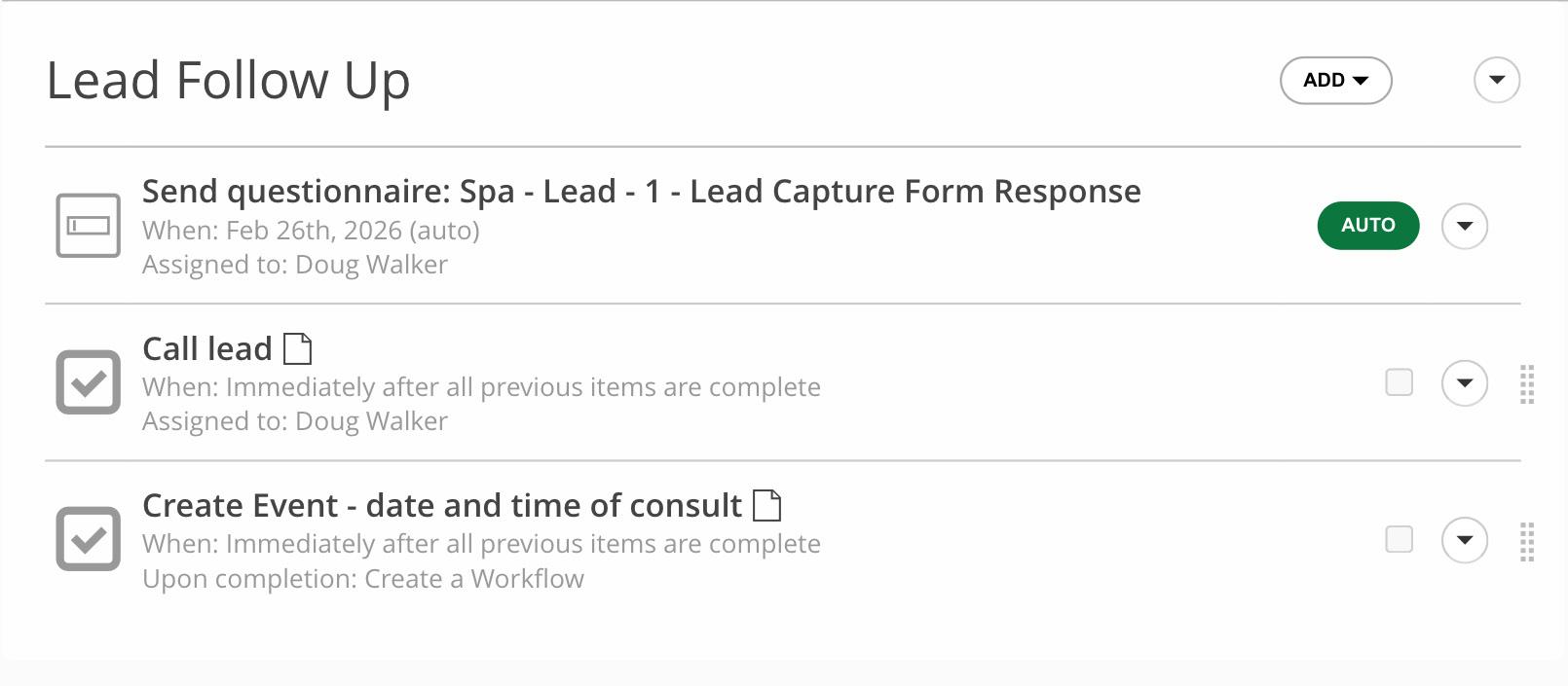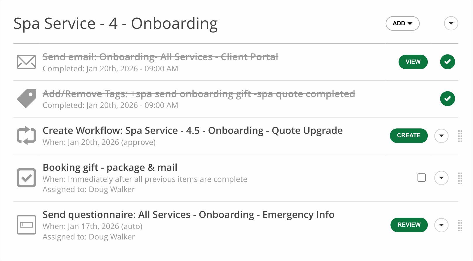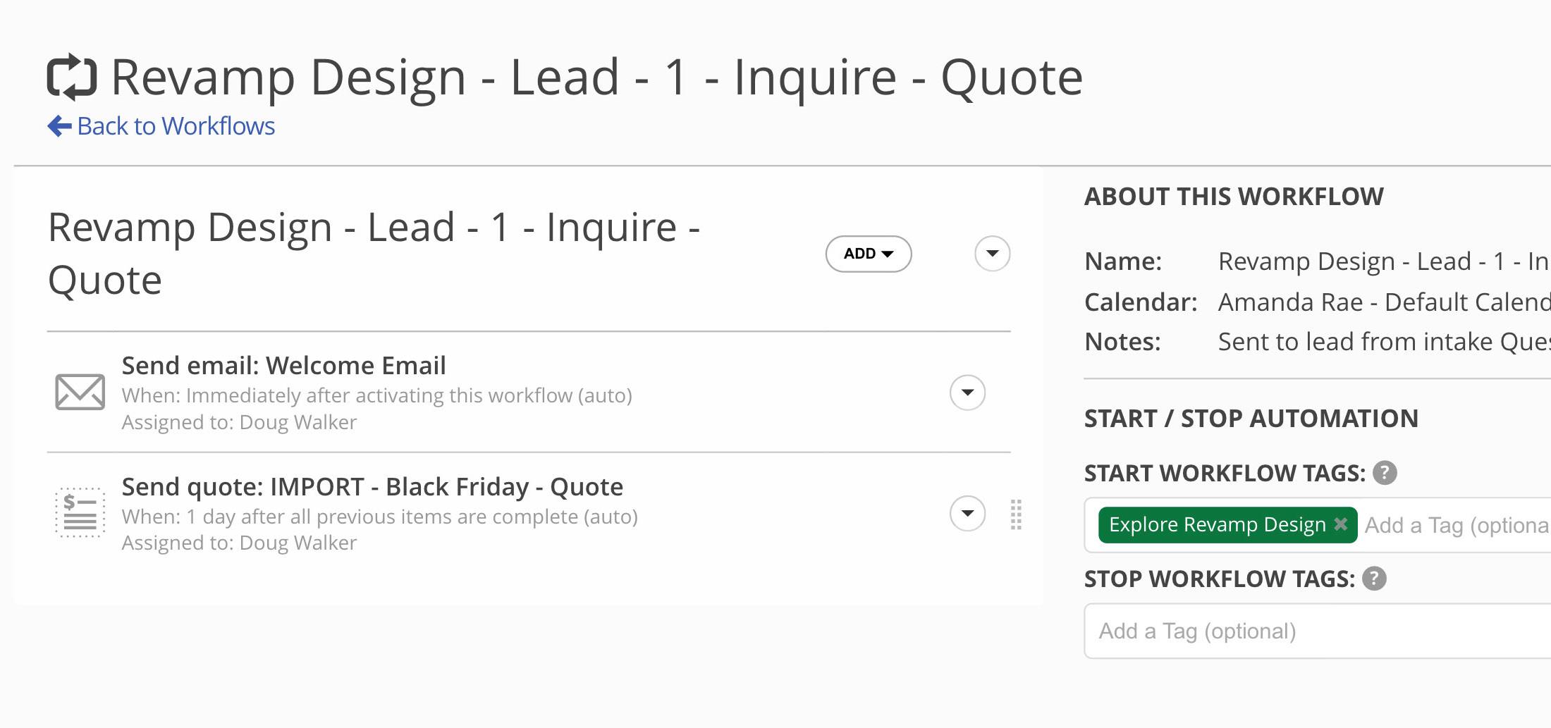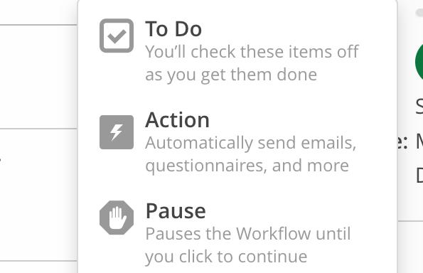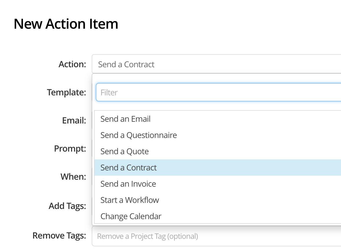 Document Follow Up: While 17hats has Automatic Reminder Emails for Documents, if you wanted to do something more specific, you could lay out a custom follow-up sequence for your documents by using the Add and Remove Tag functionality in the Workflow Step to trigger your next Workflow.