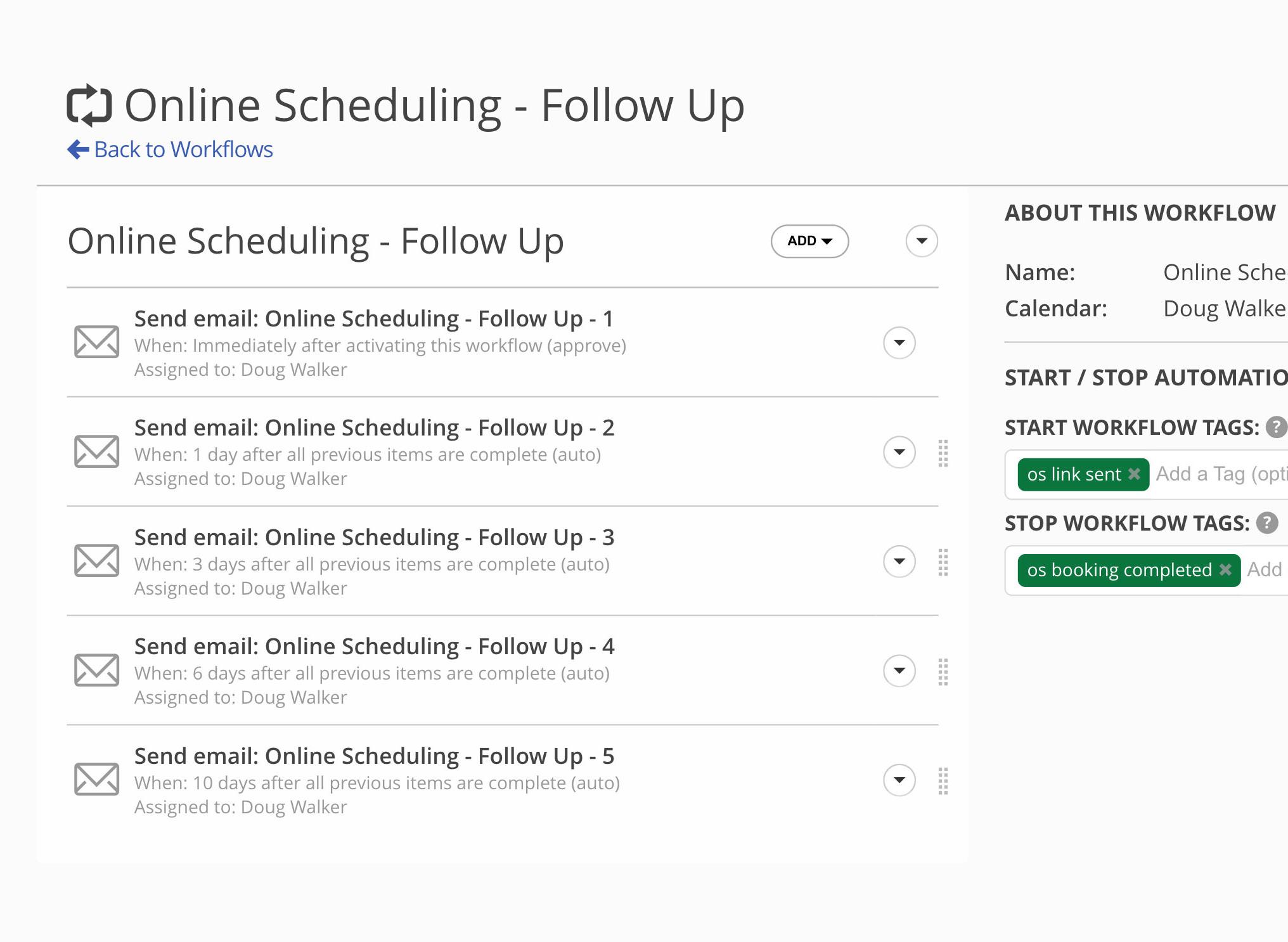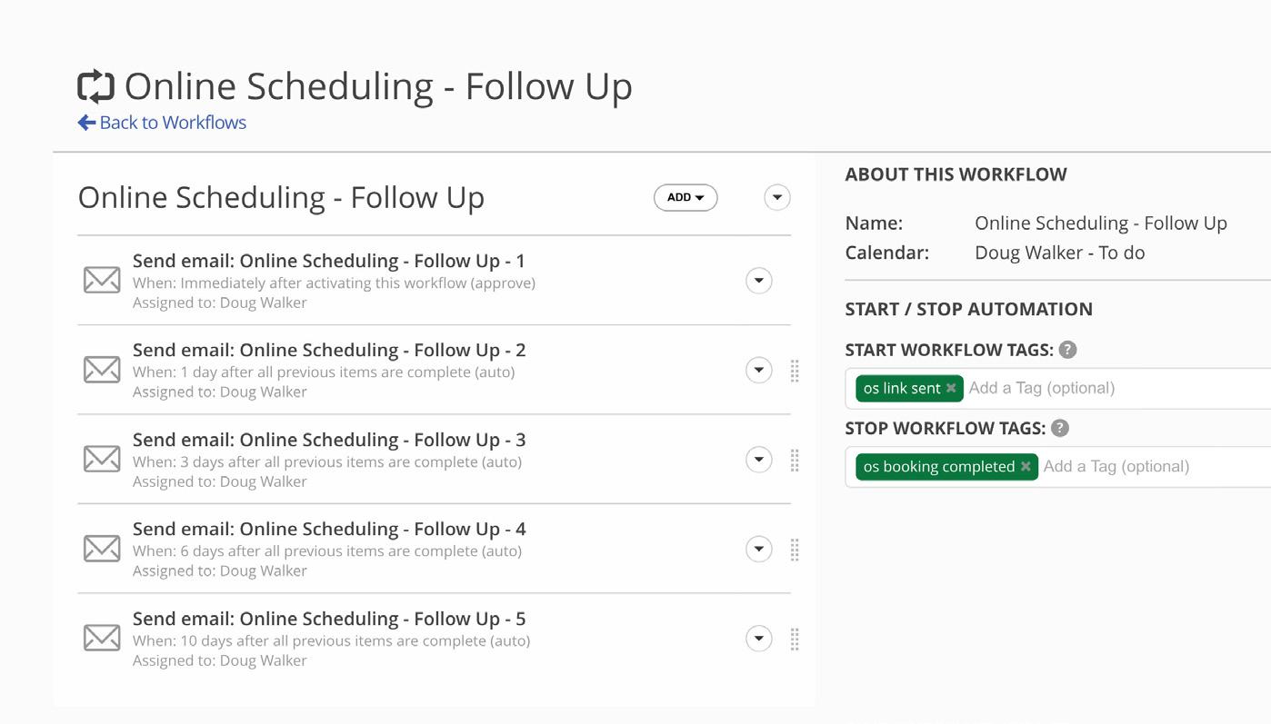 Online Scheduling Follow-up: In your Workflow you automate an email that sends your lead an Online Scheduling link. That email automatically adds the Project Tag “OS Link Sent”.