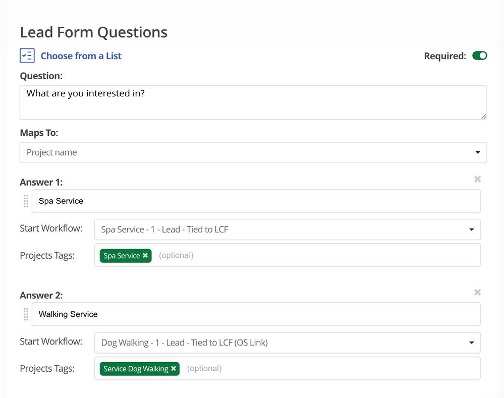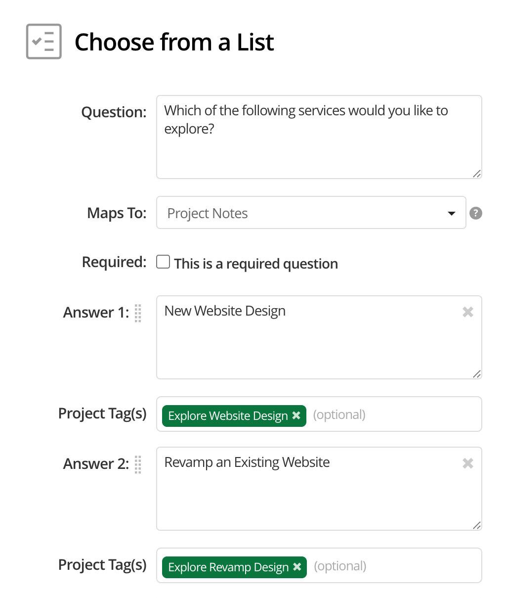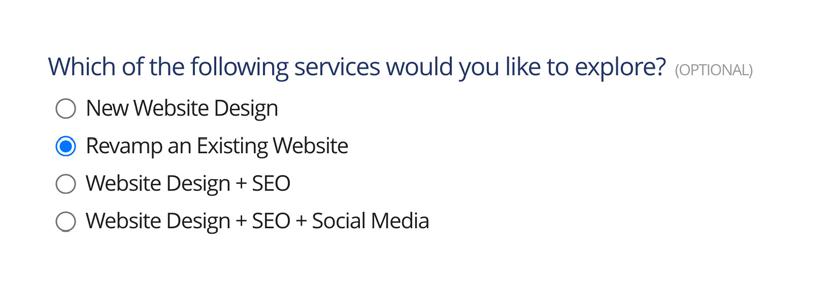 Example: A new lead completes a Lead Capture Form for a website designer. The vetting Questionnaire asks the following question: “Which of the following services would you like to explore?”