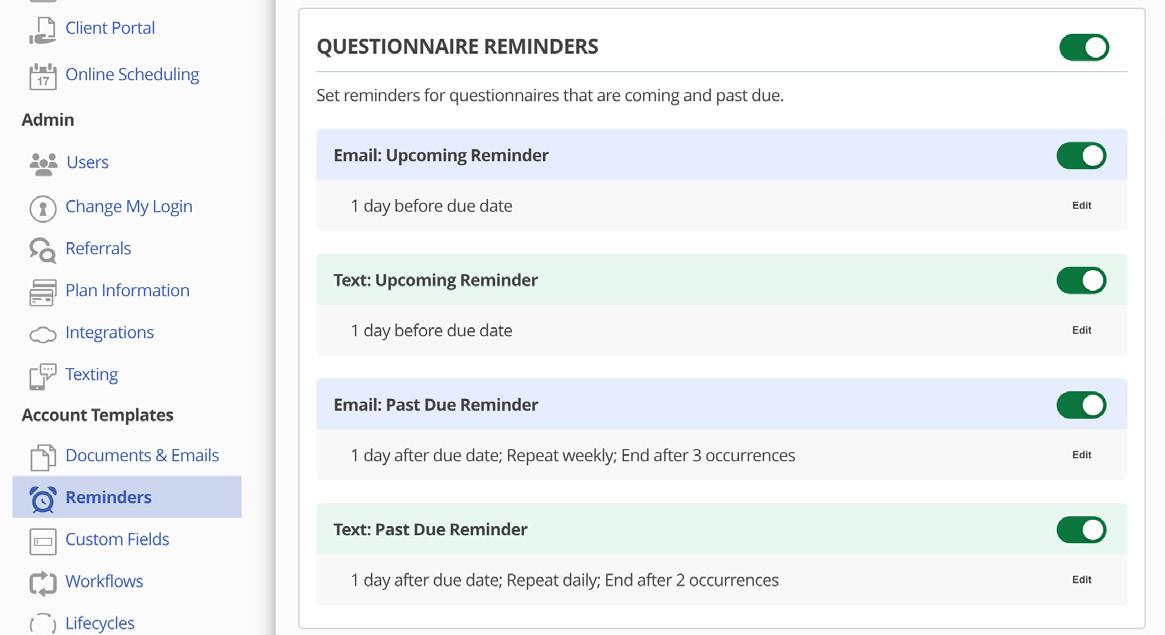 With the addition of SMS Texting, reminders now have their very own home! You’ll find all reminder communications in Account Templates > Reminders.