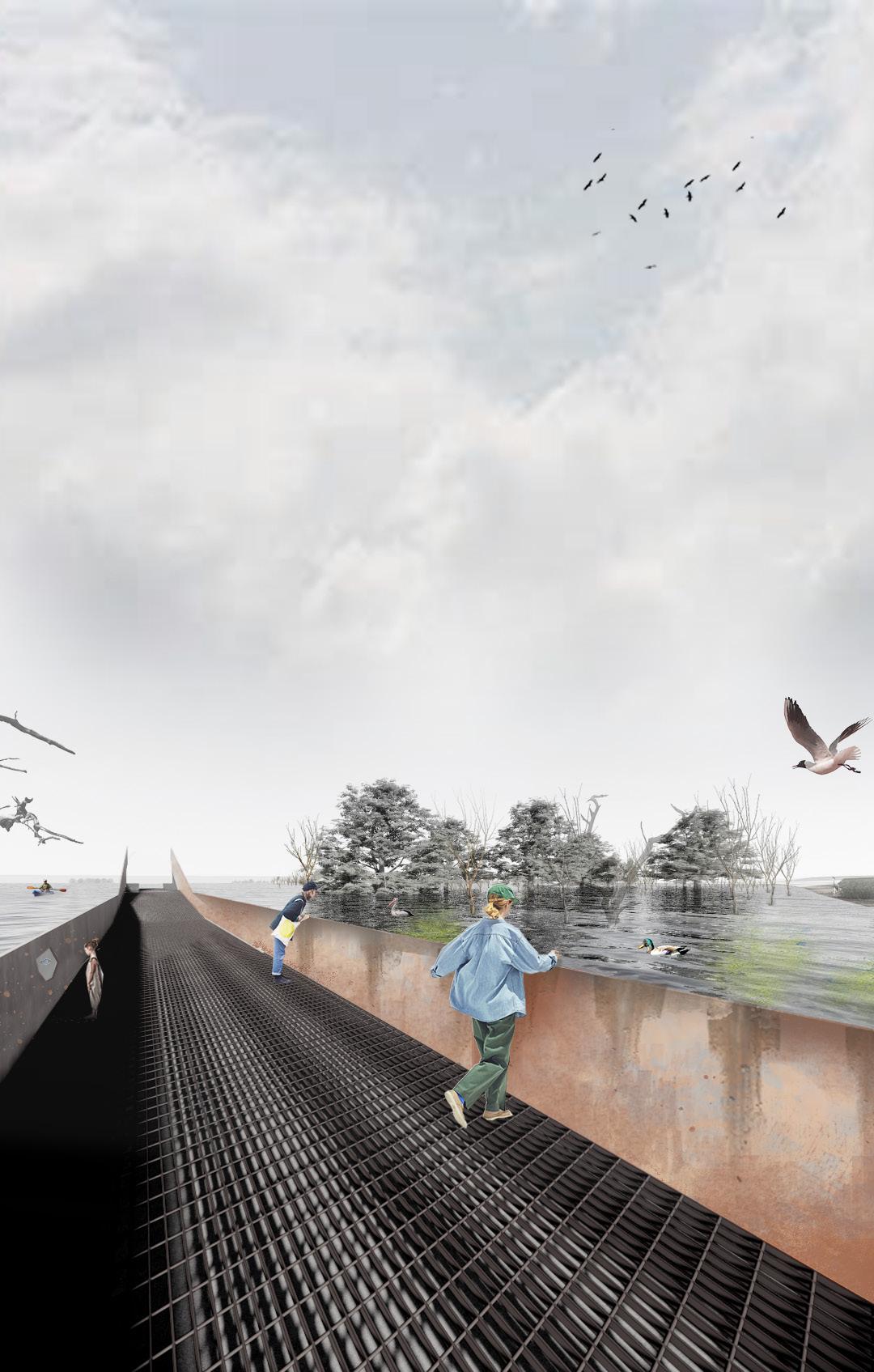 The structure itself adapts to changing water levels, evolving with the landscape and offering a unique, moment-specific experience each time. From this close vantage point, visitors reflect on their connection with the water before ascending again.