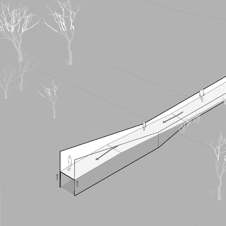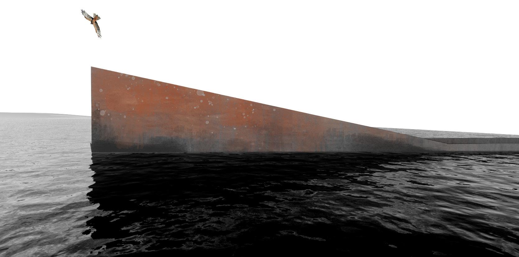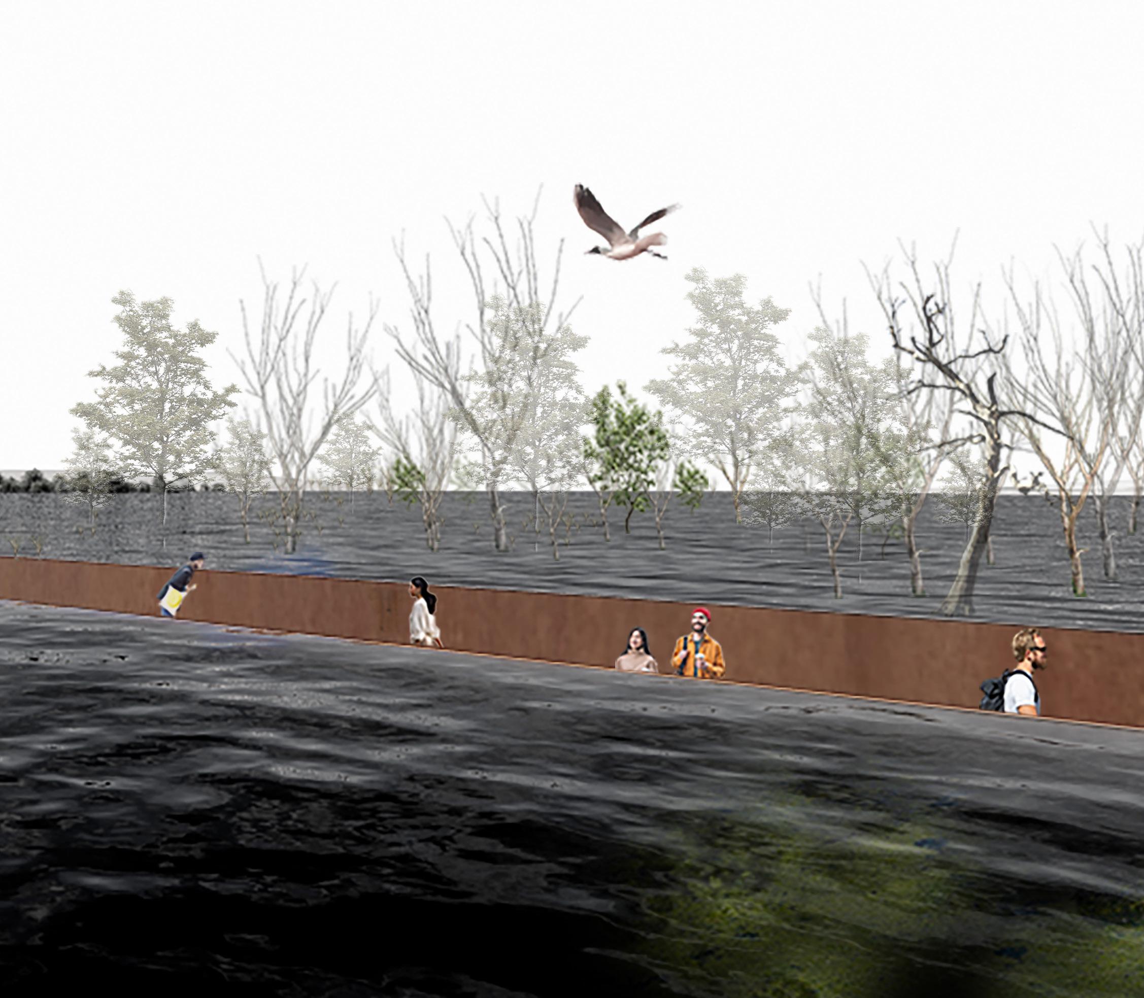 As visitors descend into the site, they are gradually brought down to water level, creating a sense of coexistence with the reservoir. The rusted corten steel walls bear marks of past water levels, a reminder of how human actions shape the environment, especially on this site.