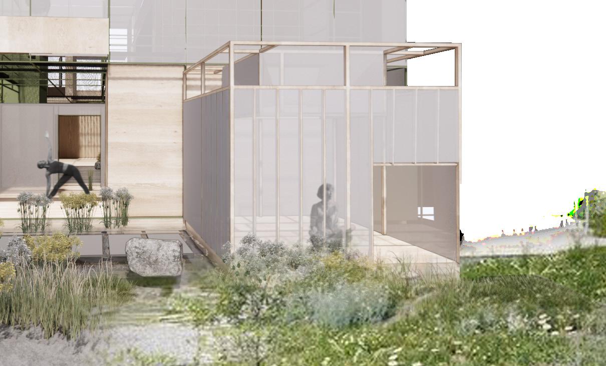 The steel structure is anchored by a central metal core, which serves as the structural backbone for the surrounding program. This spine also functions as the main circulation, guiding movement through the space. The wellness areas are designed to feel lighter and more ephemeral, reflecting the impermanent and ever-changing nature of the activities within. The contrast between the solid core and the delicate program spaces embodies a balance between stability and transformation, mirroring the journey of personal growth and well-being.