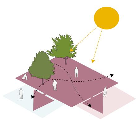 Planters filled with trees and tall grasses act as buffer between pedestrians and vehicular traffic