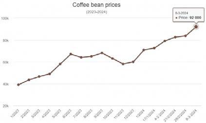 부회장 또한 공급난에 계속 되는 가운데 수요가 크게 늘 어난 것이 국제 커피가격 상 승으로 이어지고 있다고 분 석했다. 남 부회장은 "기후변 화와 엘니뇨 영향으로 브라 질, 인도네시아, 인도 등 주 요 커피 생산국의 출하량이 10~15% 감소했으며, 베트남 또한 이 같은 기후 영향과 두 리안 등 고수익 작물재배로