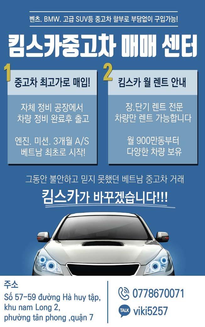 킴스카중고차 매매 센터 벤츠, BMW. 고급 SUV등 중고차 할부로 부담없이 구입가능! 그동안 불안하고 믿지 못했던 베트남 중고차 거래 킴스카가 바꾸겠습니다!!! 중고차 최고가로 매입! 자체 정비공장에서 차량 정비 완료후 출고 엔진. 미션. 3개월 A/S 베트남 최초로 시작! 킴스카 월 렌트 안내 장 .단기 렌트 전문 차량만 렌트 가능합니다 월 900만동부터 다양한 차량 보유 주소 Số 57-59 Đường Hà Huy Tập, Nam Long 2, P. Tân Phong, Quận 7 077 867 0071 viki5257 중앙은행, 은행권 대출금 리 최고 2%p 인하 촉구 호찌민 지하철 개통 또 지연되나? 운행 계약업체와