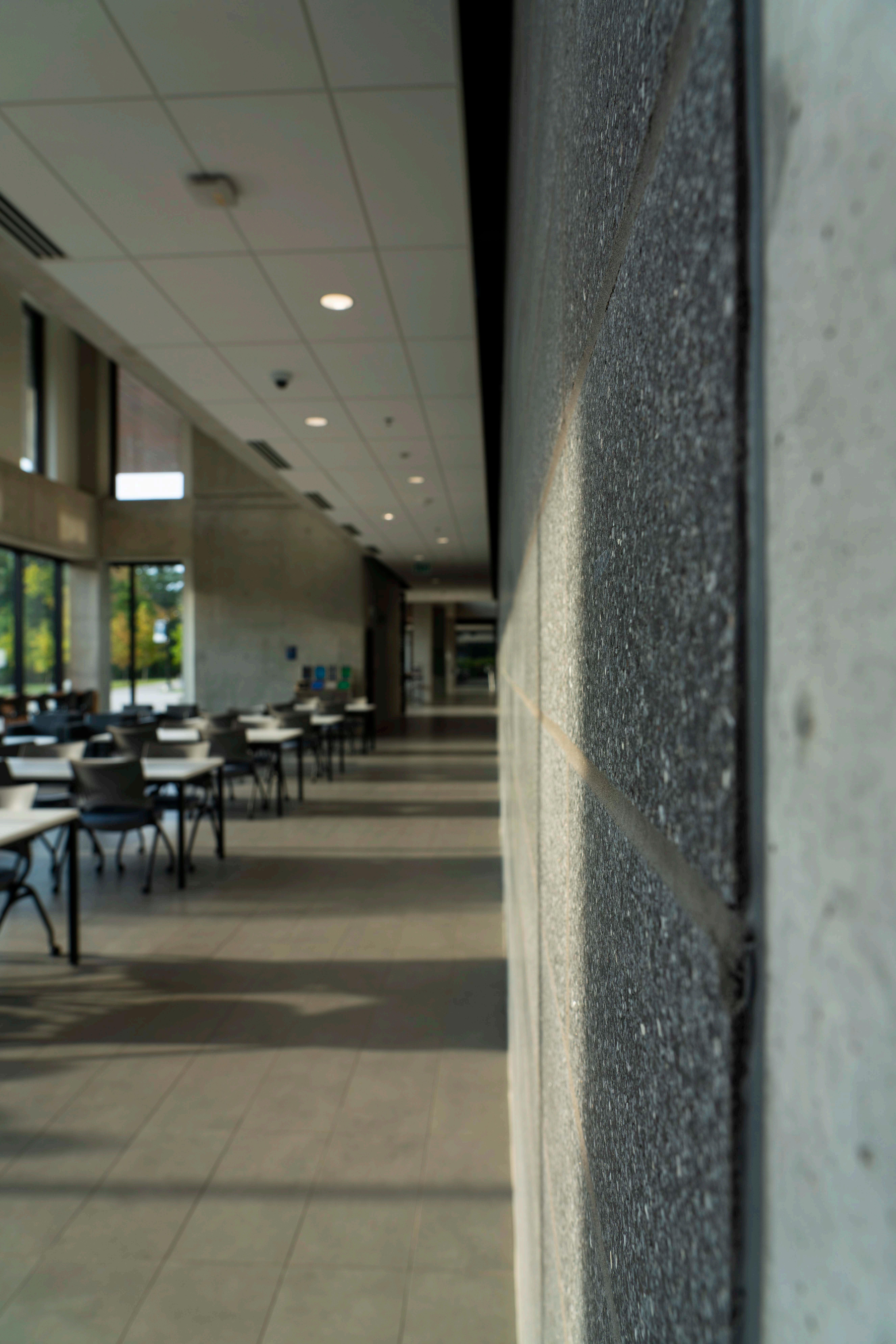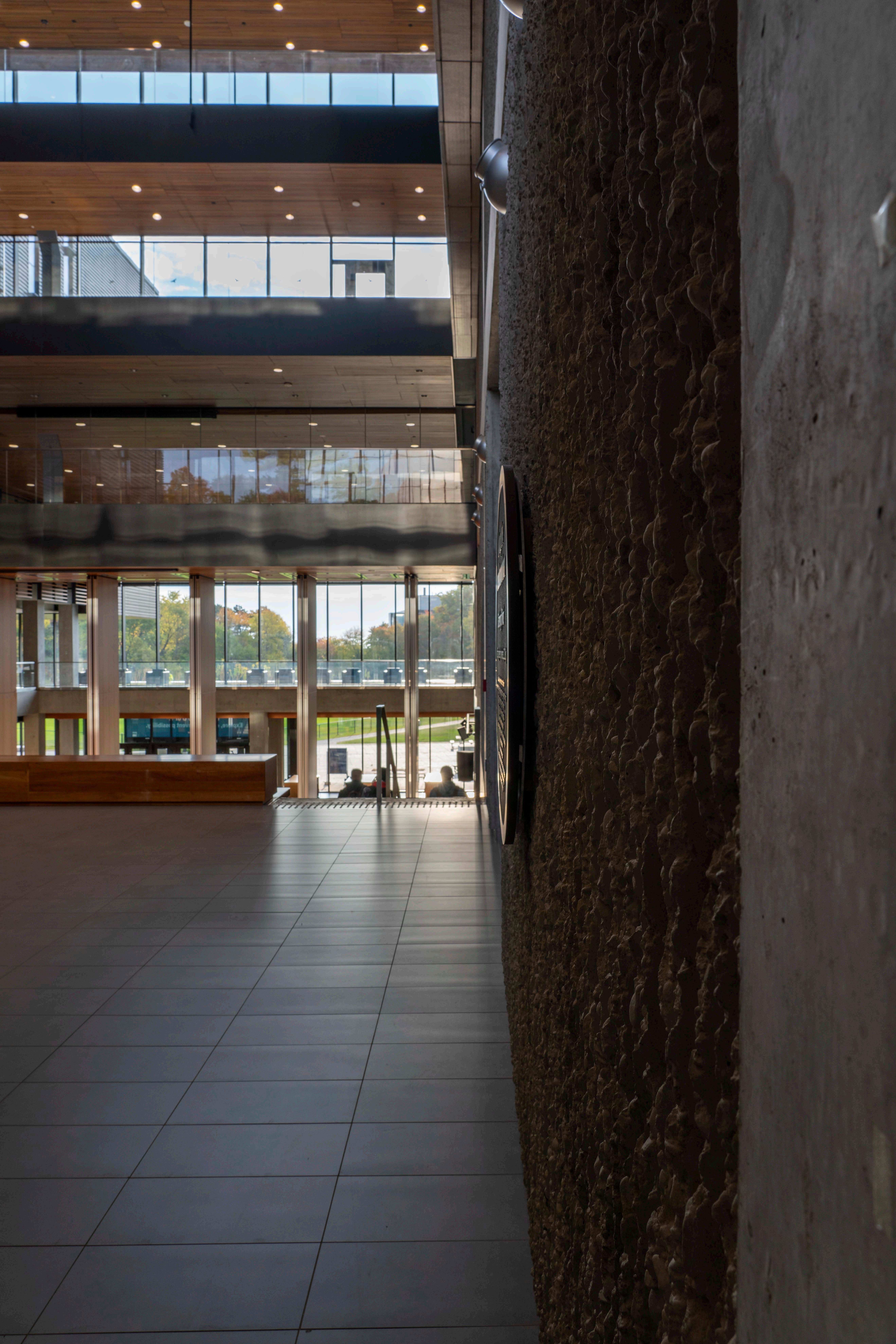 The west entrance is the 3rd photo, having moved forward from the previous positions Visible are the east-facing windows presenting the large fie d the first photo was taken from and another look at the natural surroundings. This detail addresses the materiality of wood, glass and metal in this interior; it also captures a plaque with a message the school deemed important to share Finally, as reading week begins, students are seen only passing by