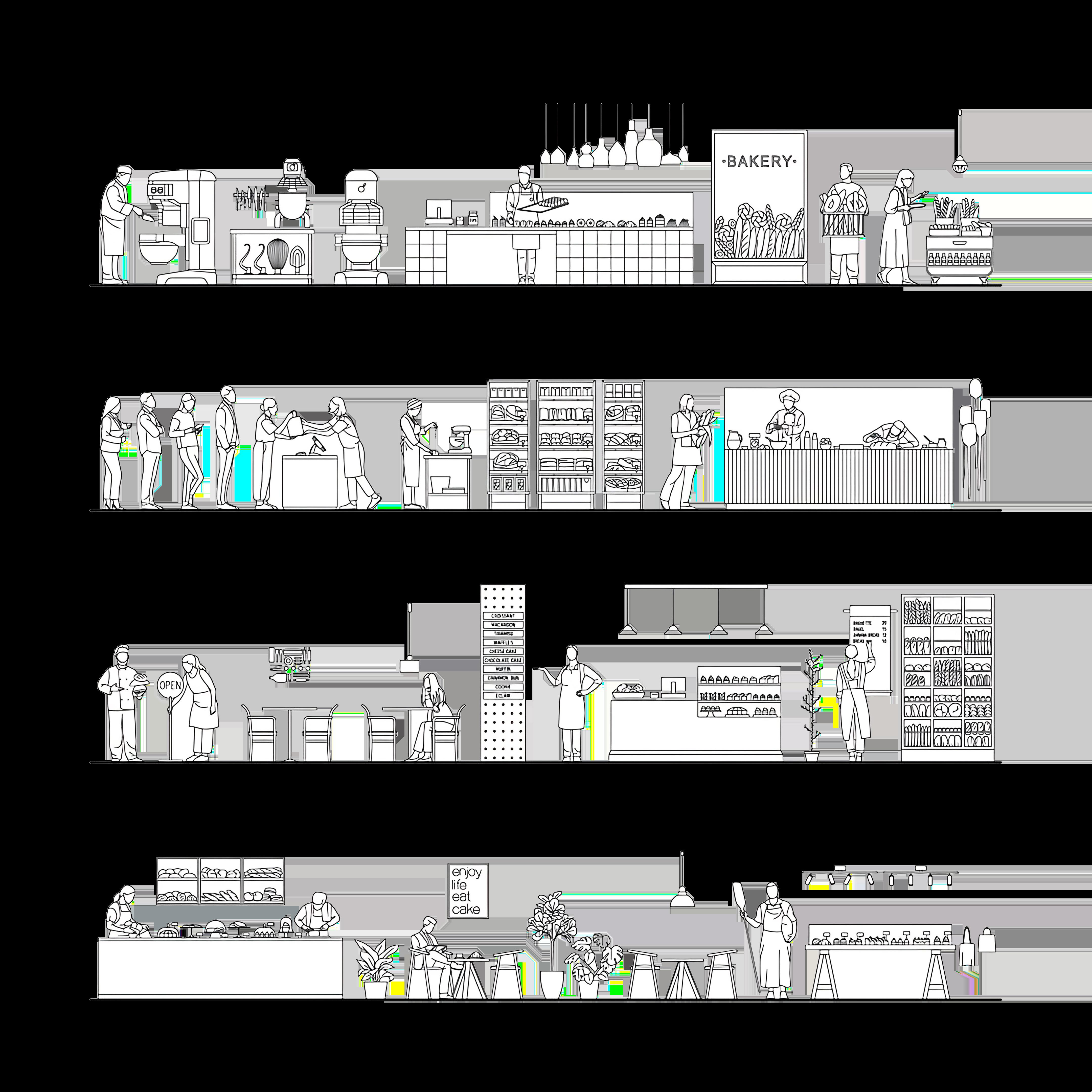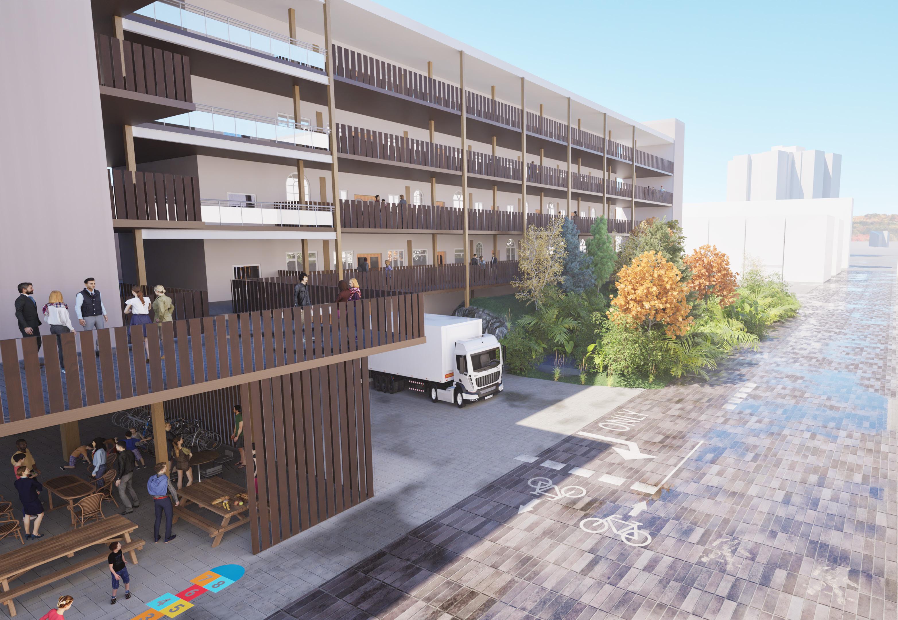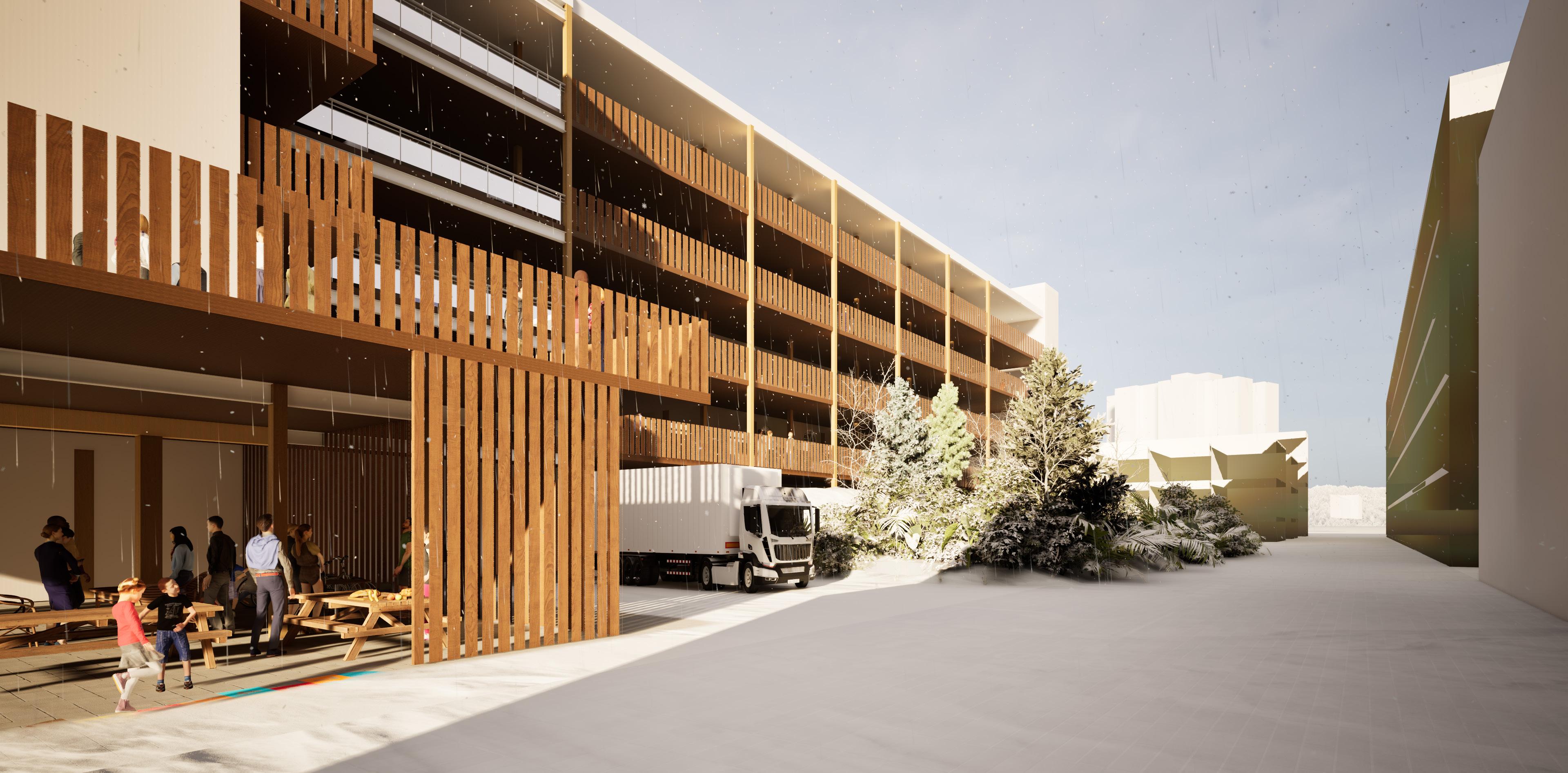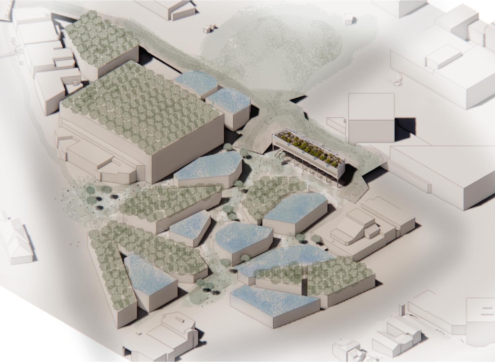 In response, the proposal organizes the site as a “pixelated” mosaic of interconnected programs shaped by circulation, which intends to draw families into a familiar yet revitalized denser mass timber housing complex. A market, bakery, grocery store, and culinary learning space animate the public lower levels, while housing above is designed for both seniors and families to encourage a more intergenerational downtown community. Paths, porches, terraces, and green buffers mediate between the building and the city, creating spaces for gathering while softening the transition between active public zones and more private residential life. Rather than treating the project as a singular object, the design uses landscape and program to stitch together multiple forms of dwelling, commerce, and public activity into a more porous and community-oriented urban block.