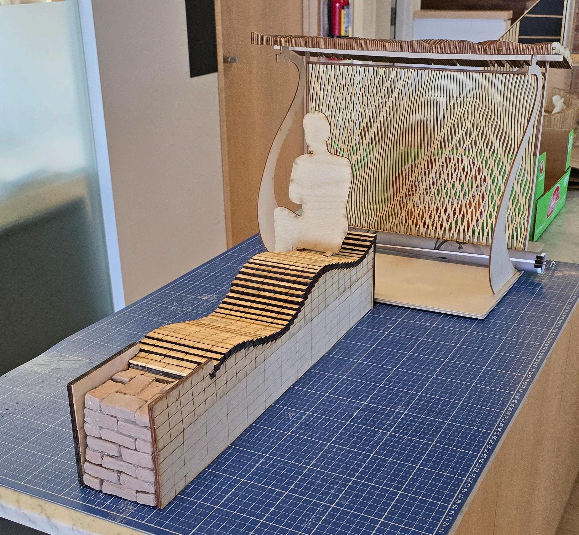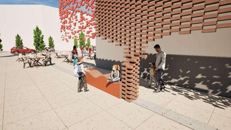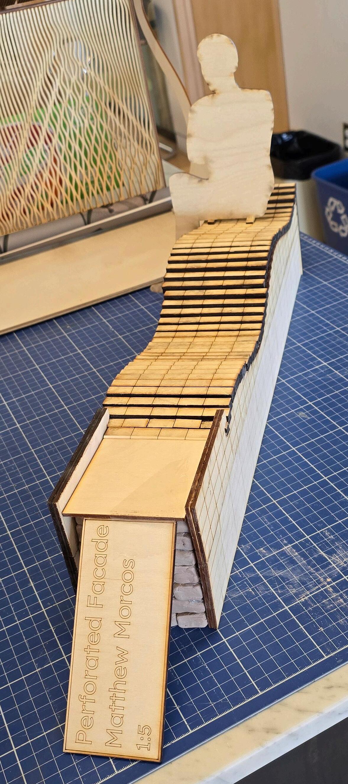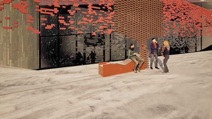 The design directly integrated with a project from a different class. The proposal combines seating, enclosure, and façade-like screening into a modular brick-and-wood intervention that activates the edge of the site as a place to pause, gather, and inhabit. A repeated panel system and carefully sequenced assembly create a structure that shifts between bench, surface, and vertical filter, using variation within a controlled parametric logic to shape the overall form. Rather than functioning as a standalone object, the intervention is conceived as an extension of public life at the building’s pe-rimeter, bringing together tectonic detail, fabrication logic, and social use in a small but highly constructed urban element.