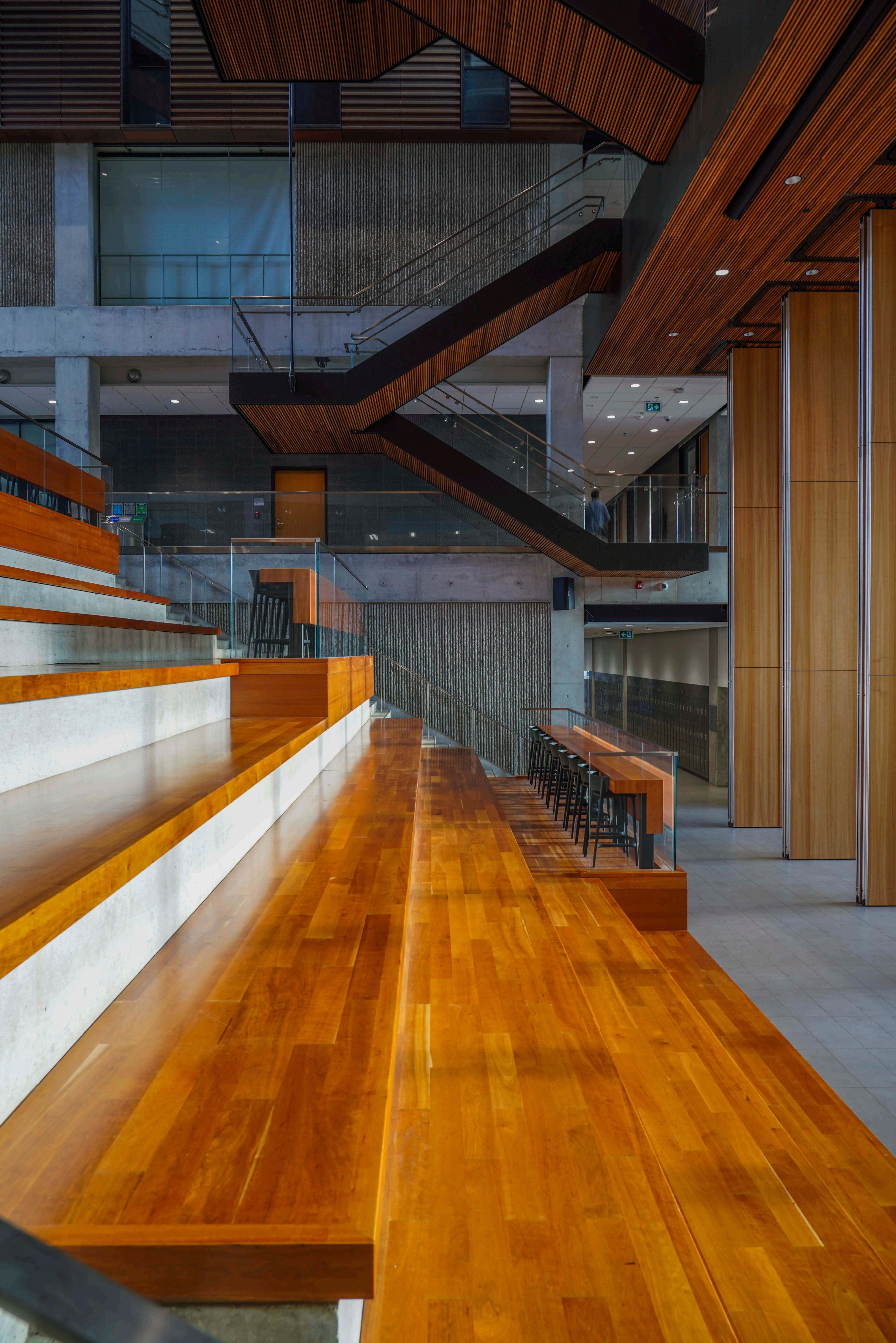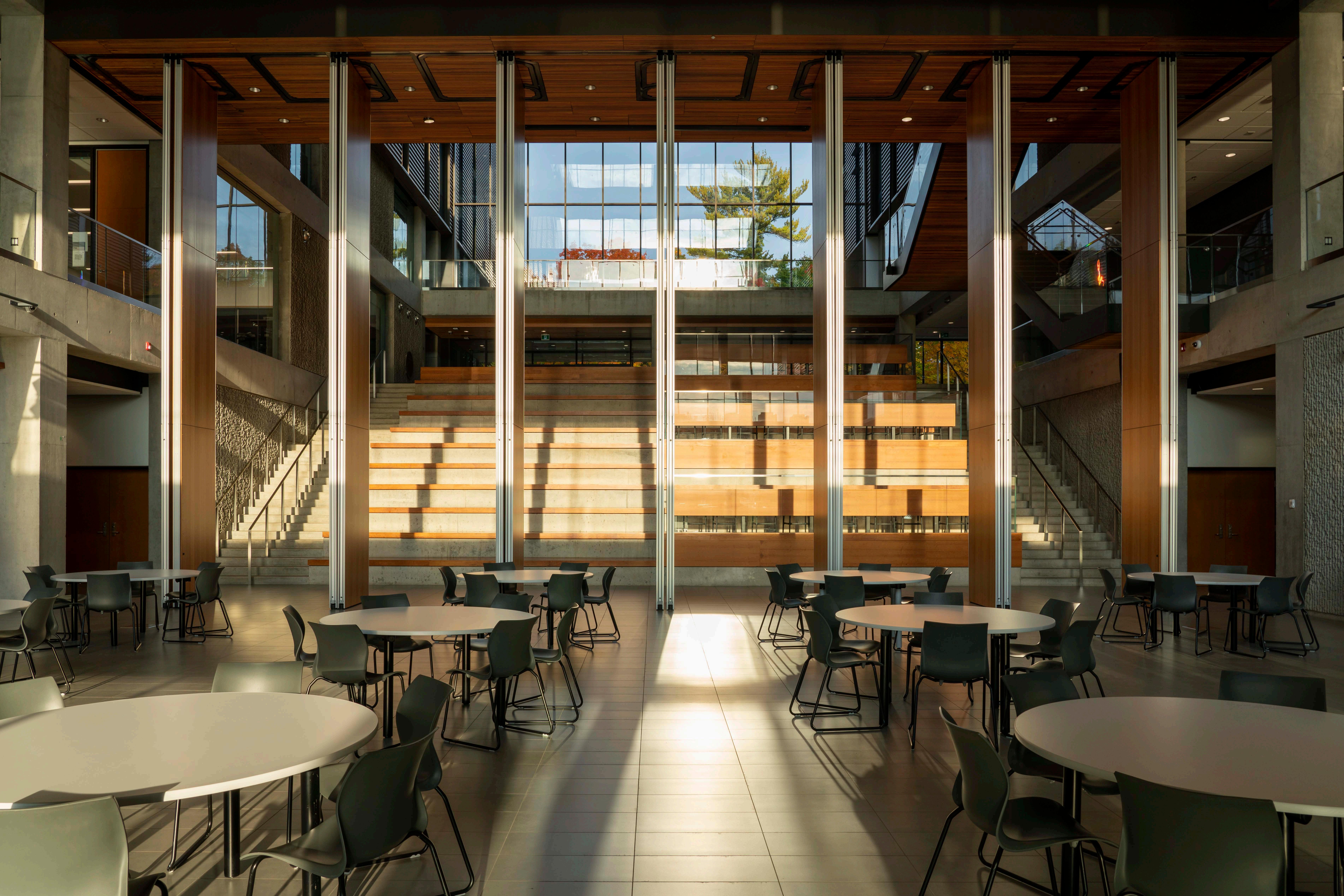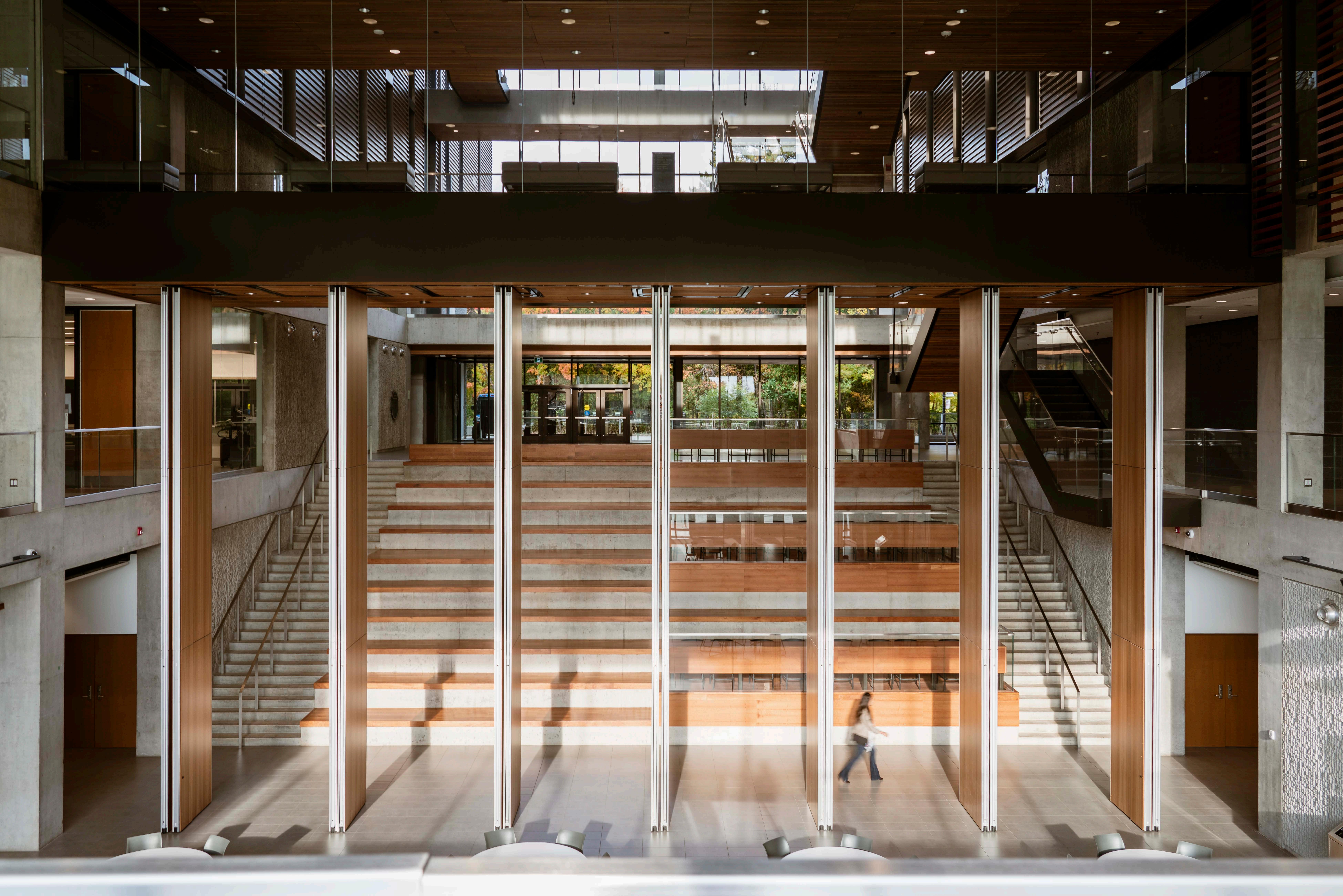 In between the 2nd and 3rd photos are the seats of the atrium. It makes the size of this space even clearer as the bottom of just the 3rd set of steps is visible. This warm tone from the morning light off all the wood surfaces makes the space feel connected to the outside natural environment and the light itself.