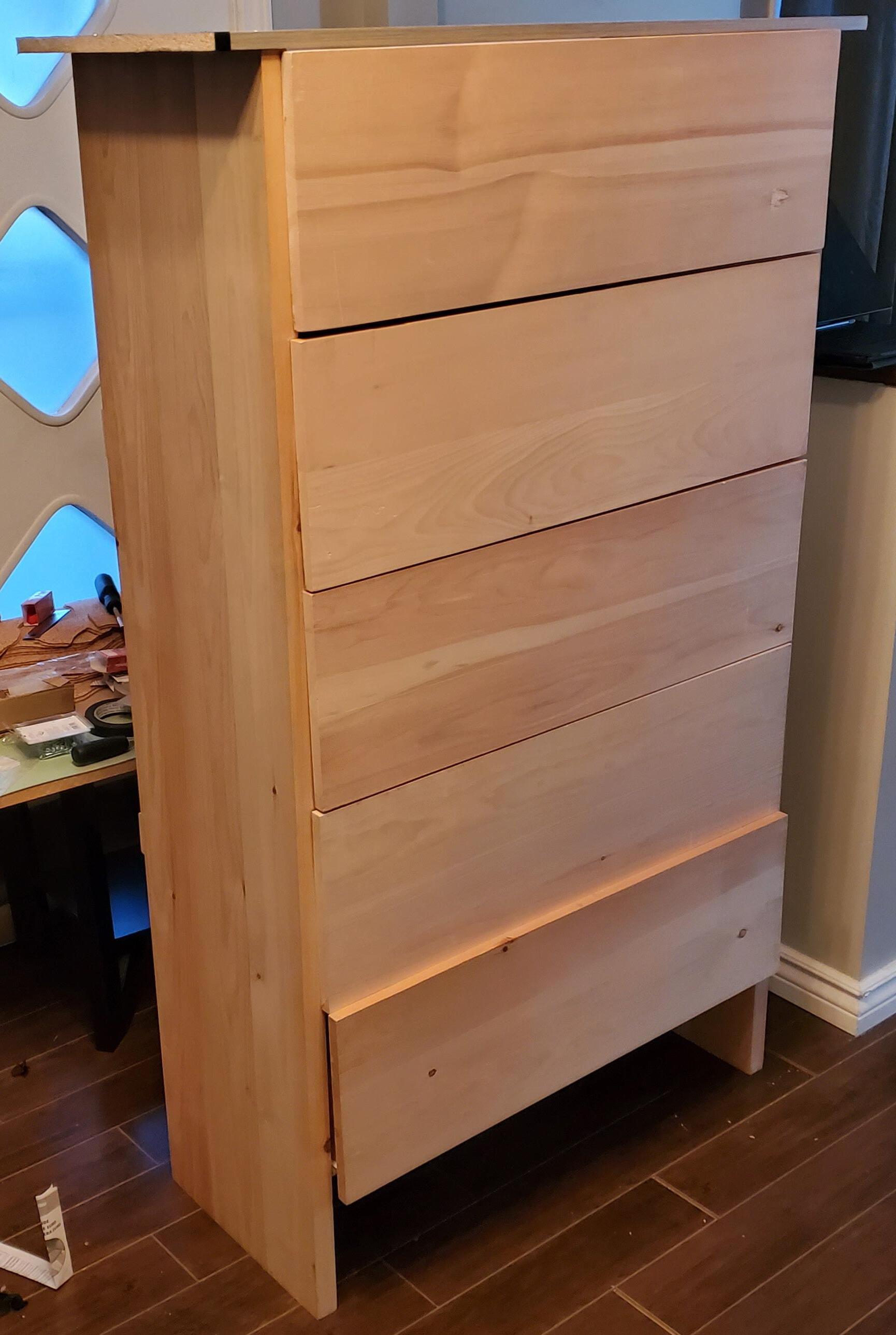 Namely, one of the many mistakes I learned from was: assembling the sides and top of the dresser before the individual drawers This led to the whole structure to be precarious, and I ultimately had to scrap those large parts