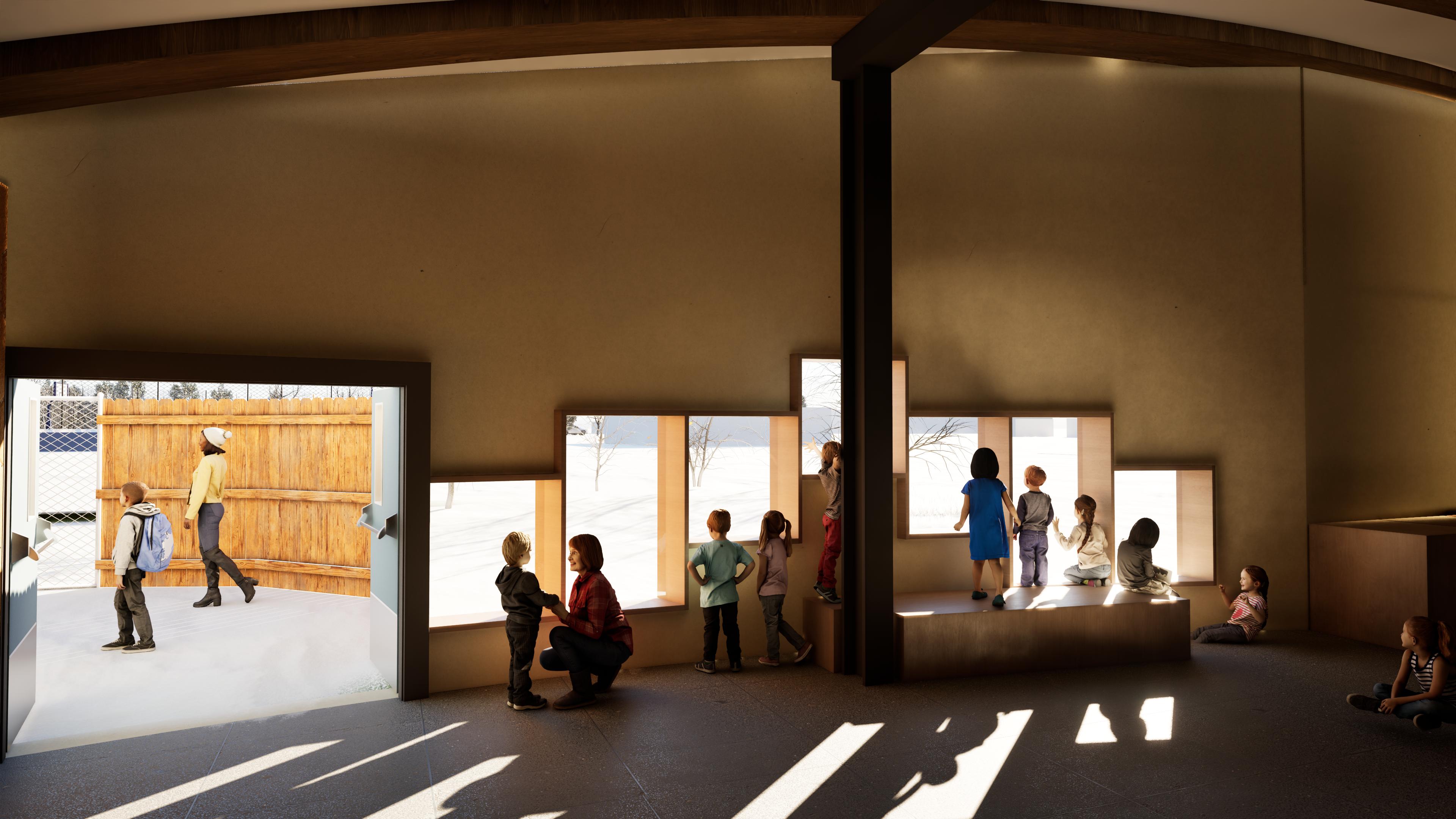 The project is organized around the idea of duality: connection and separation, openness and refuge, community and individuality. Sited in Sudbury’s Flour Mill area, near a busy roadway and between residential and light industrial conditions, the proposal responds by creating a protected yet porous environment for children. Form, layout, and detail are used to connect the building to nearby green space, to the surrounding neighbourhood, and to the child’s own sense of curiosity. Through dynamic openings, playful spatial transitions, and carefully scaled indoor and outdoor areas, the design frames learning as an active, exploratory experience shaped by movement, discovery, and connection to place.