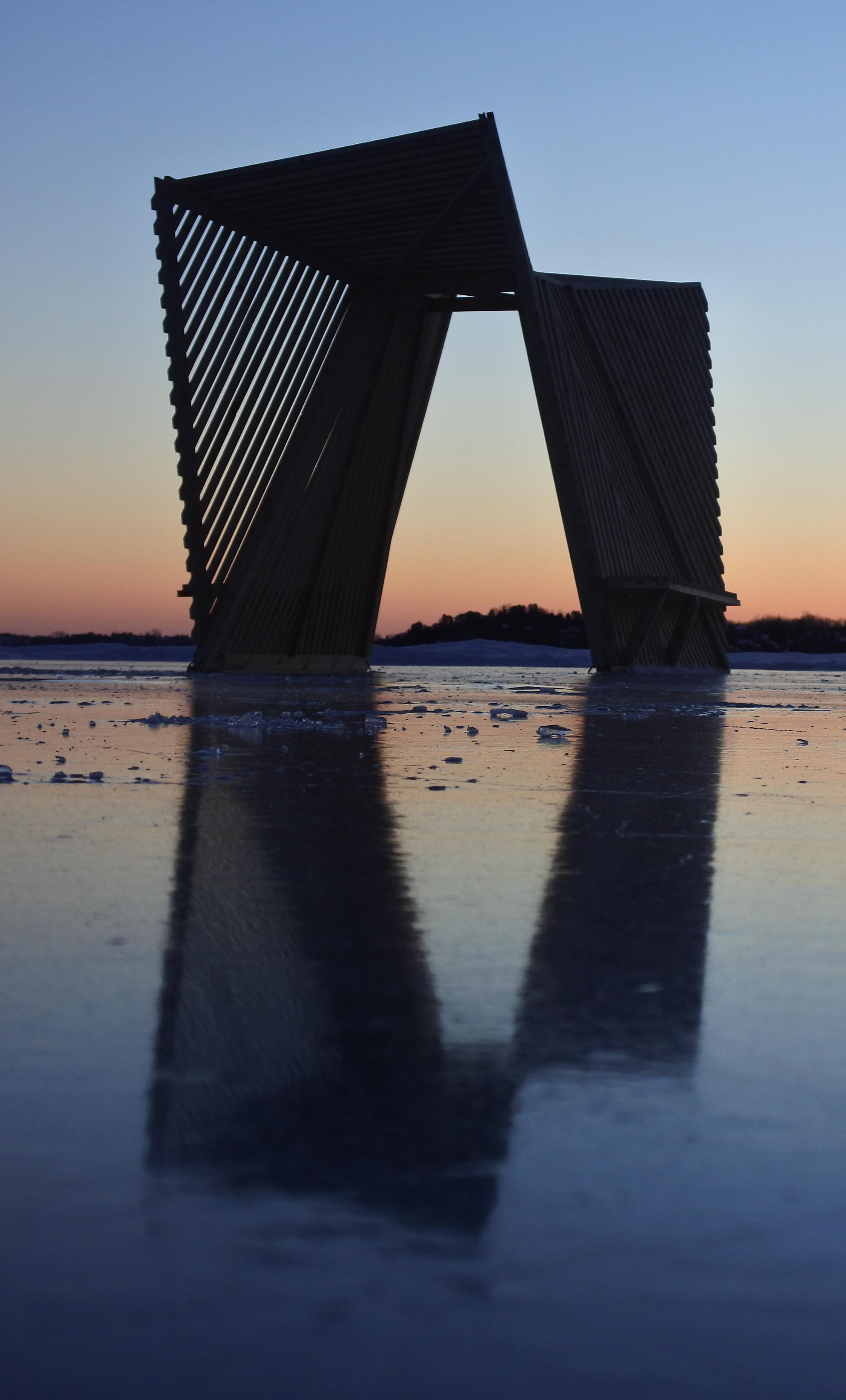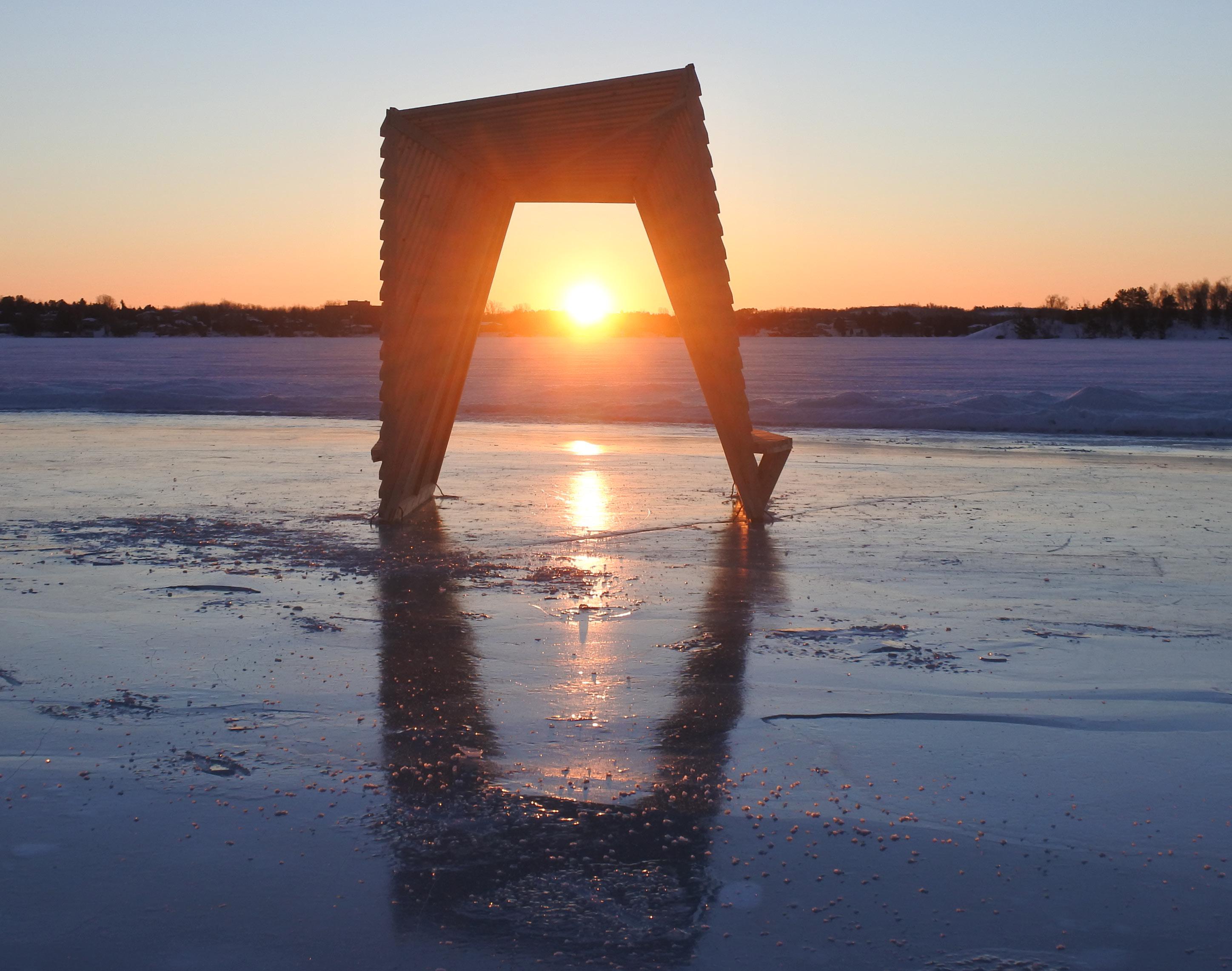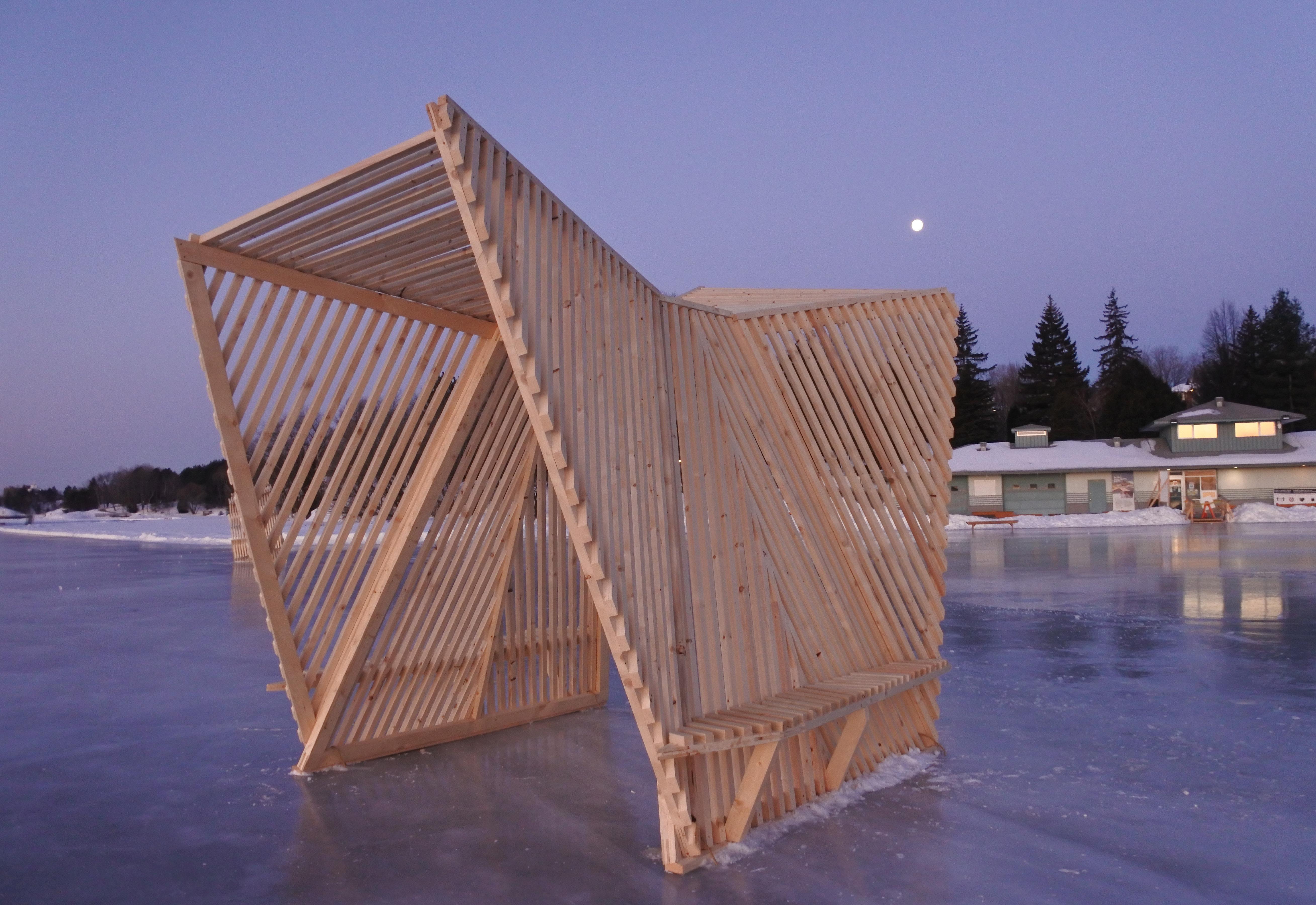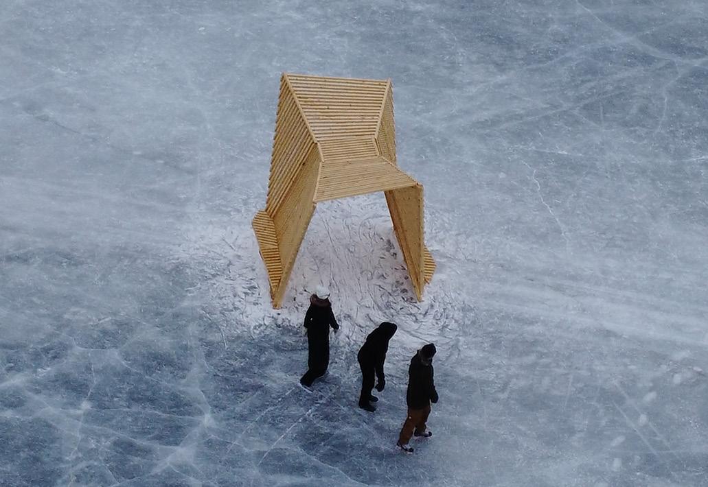 Built primarily from untreated wood and assembled through simple, low-impact construction methods suited to remote cold-weather conditions, the structure was designed for durability, ease of fabrication, and natural material uses. Rather than functioning as an isolated object, the installation acts as a small communal landmark on the lake: a place of passage, pause, shelter, and gathering. In this way, the project connects education, community, and place, demonstrating how temporary architecture can foster interaction, reflection, and a deeper engagement with Northern environments.