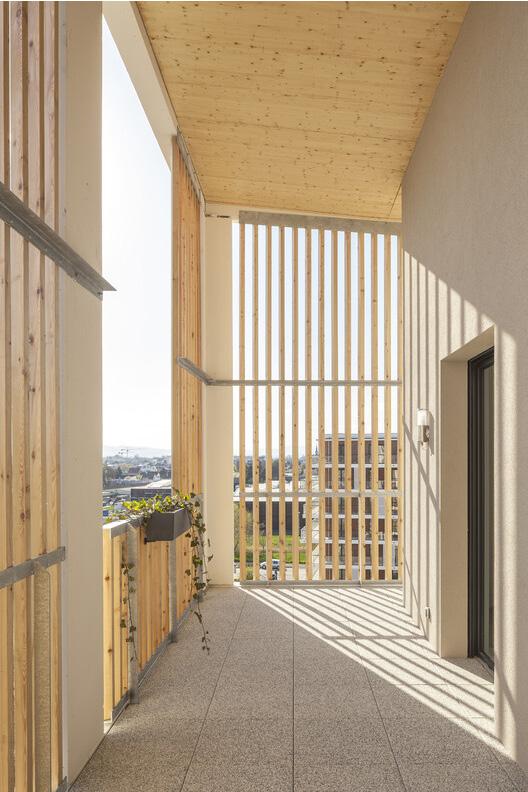 The 5th photo demonstrates the building s second and most common materials concrete and tile. These walls bonce the sunlight and fill the rooms. Because of this, even though this detail is focused on the wall, the farthest parts of the image are still clear enough to understand the idea that the end of the hallway is a mirrored space from the one in this photo.